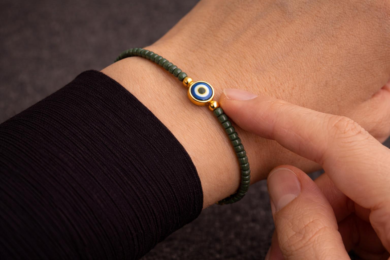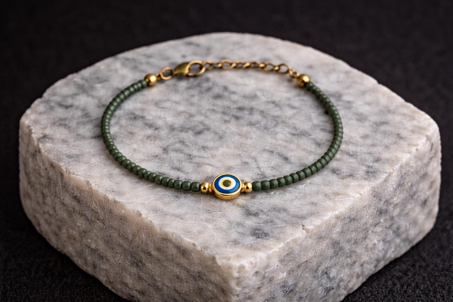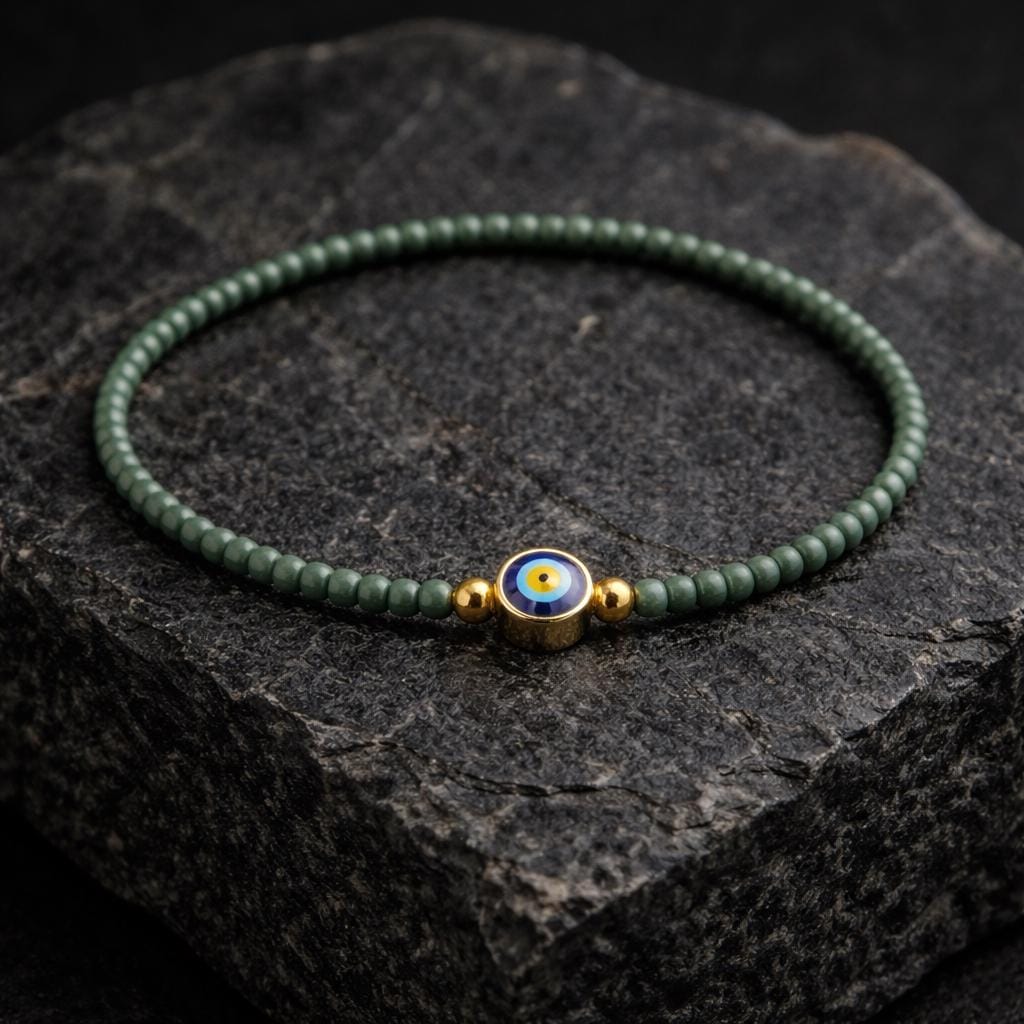 This elegant green beaded evil eye bracelet is designed for everyday wear with a touch of meaning and style. Featuring delicate dark green beads and a gold-toned evil eye charm, this bracelet symbolizes protection, positivity, and good energy.