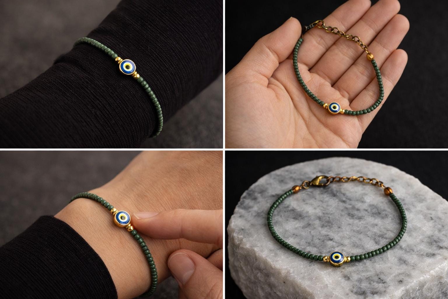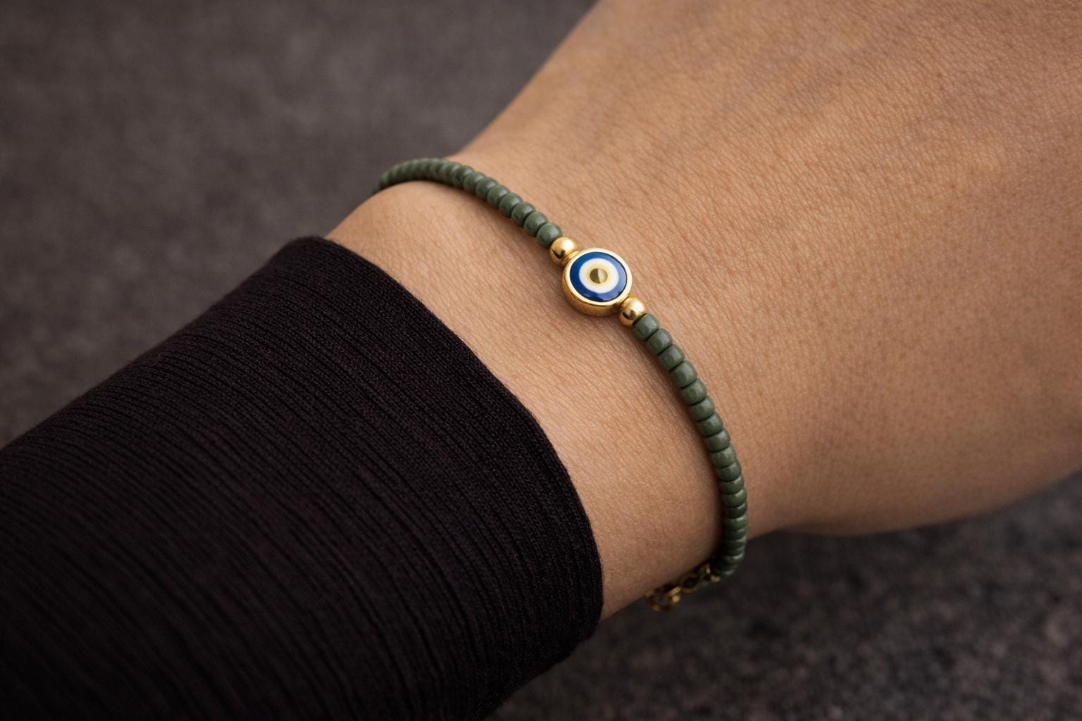 Green Beaded Evil Eye Bracelet, Minimal Nazar Bracelet, Gold Charm Bracelet