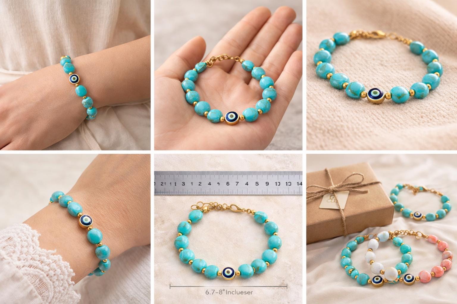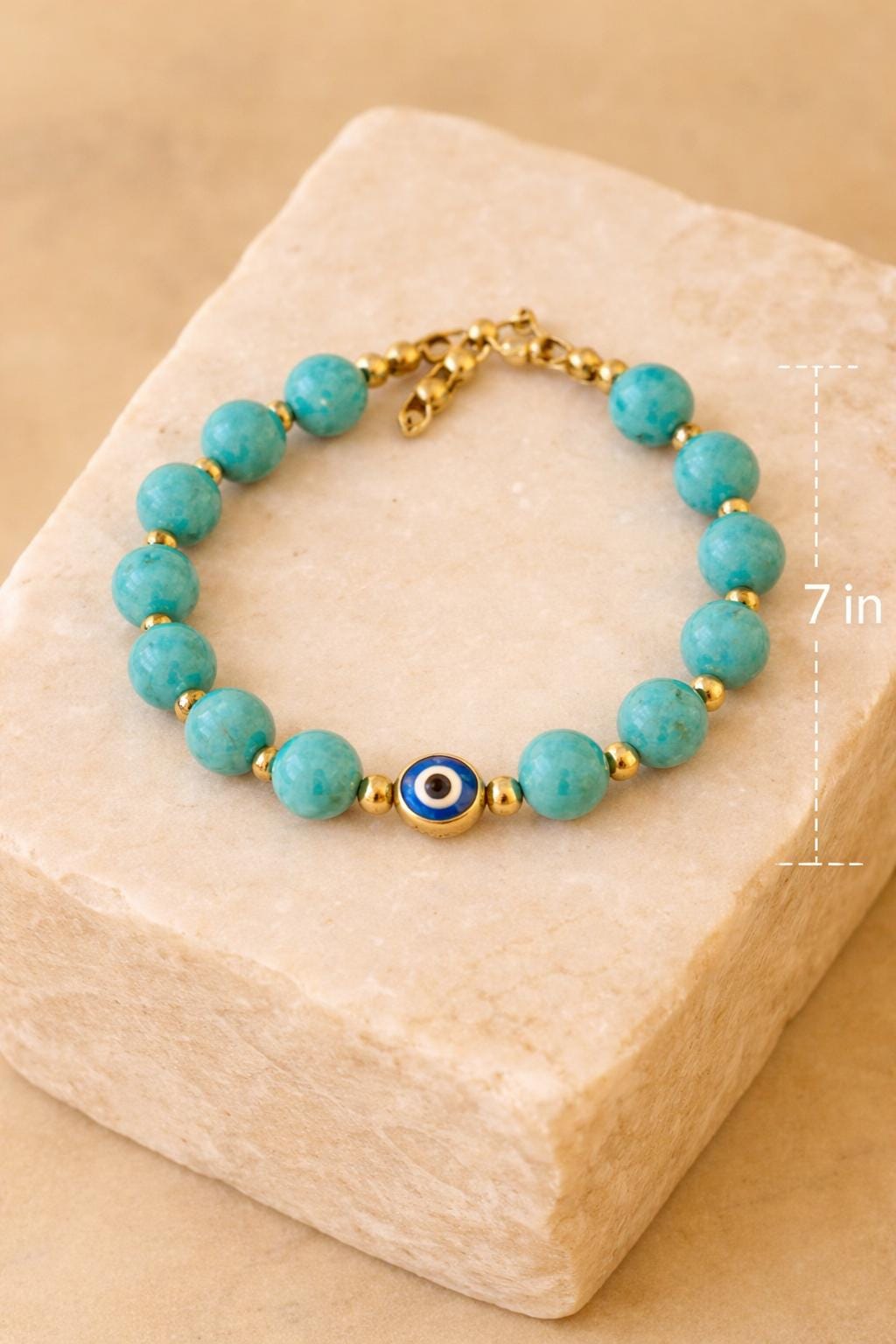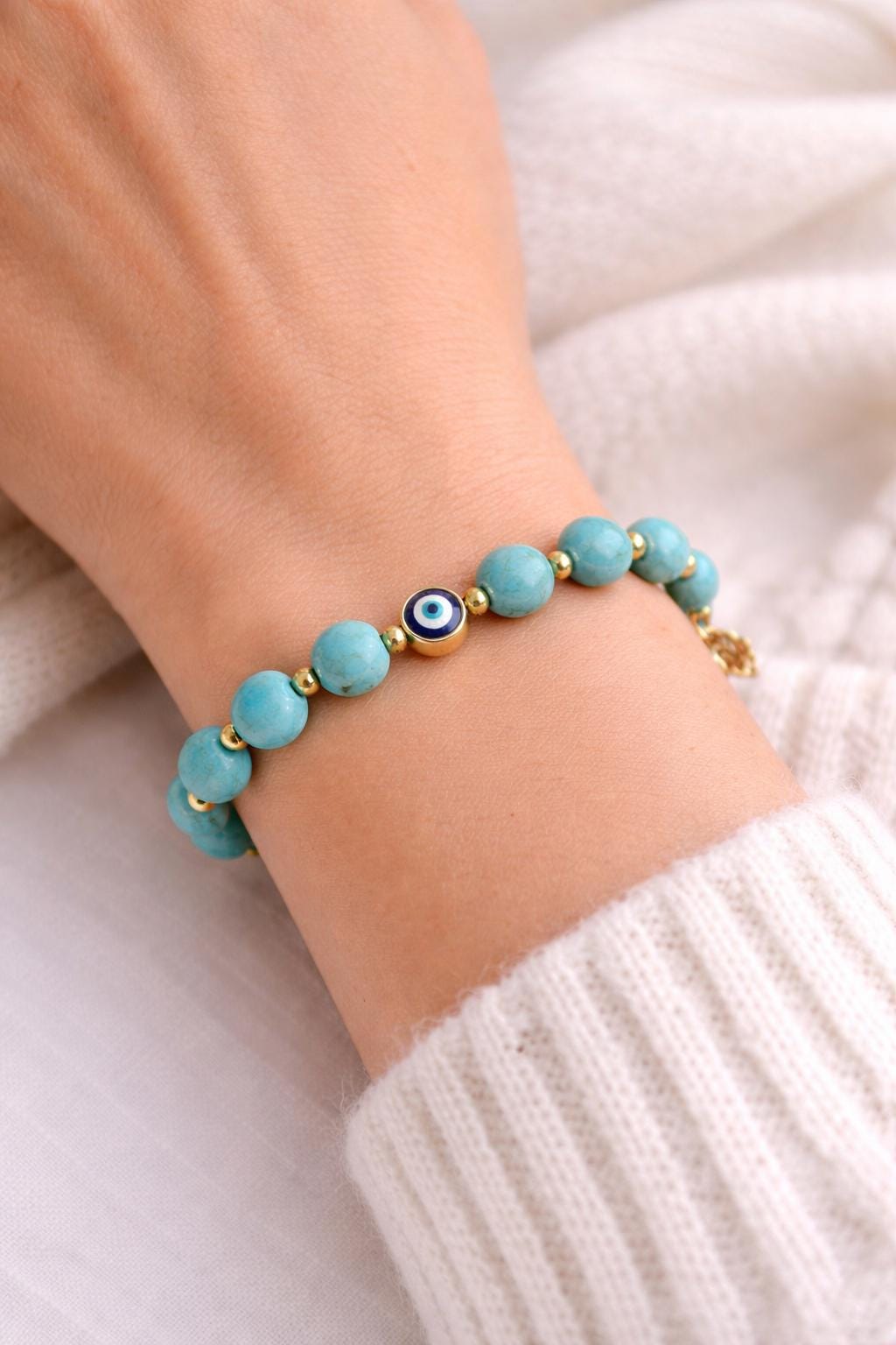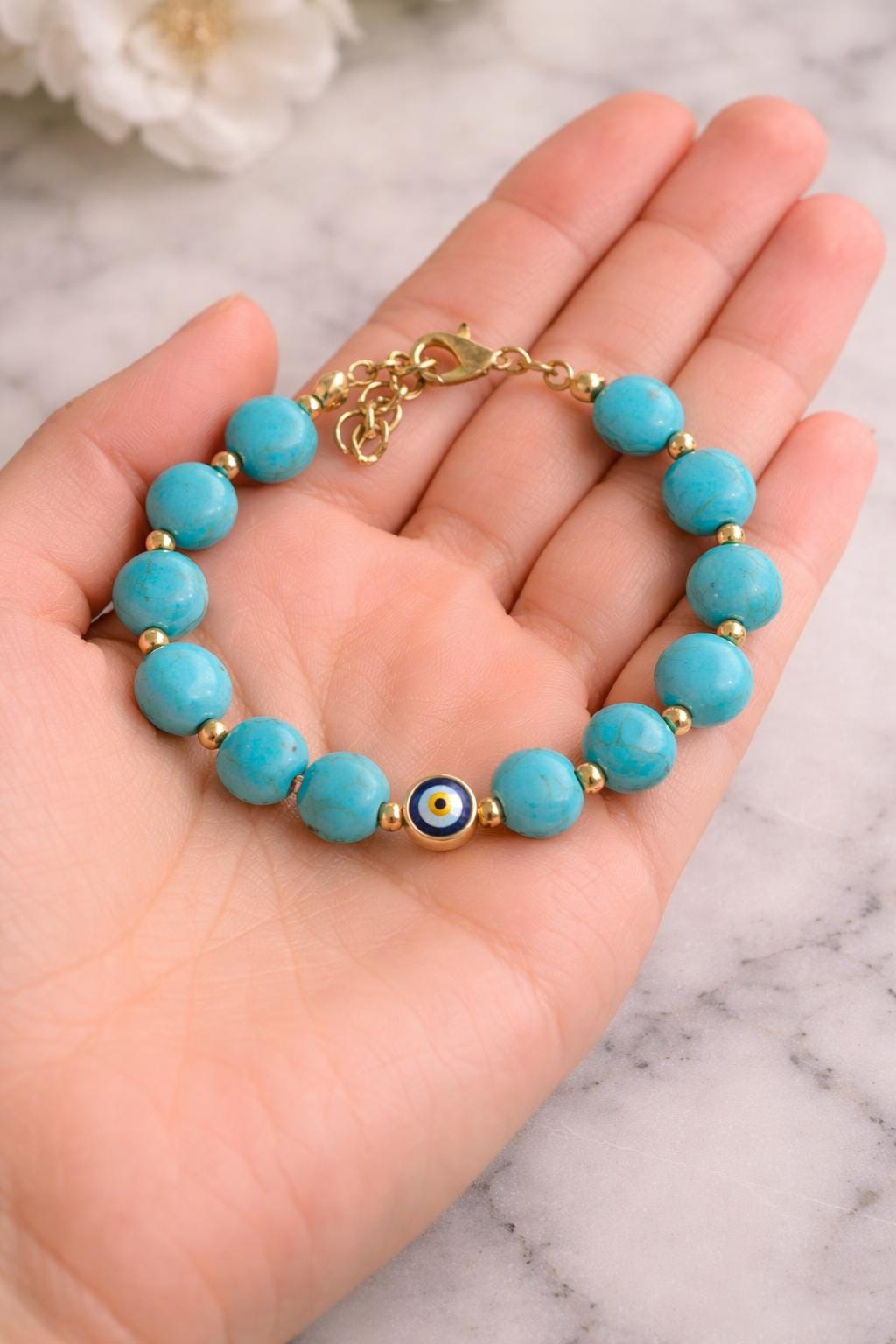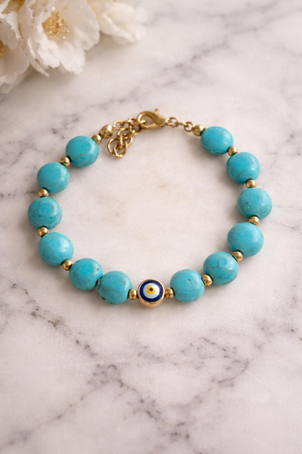 This elegant bracelet features turquoise-style beads accented with gold details and a classic evil eye charm, making it perfect for everyday wear or a meaningful gift.