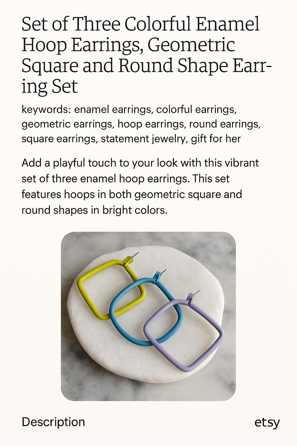 Add a playful pop of color to your accessory collection with this bold and stylish geometric earring set! Each set includes 3 unique pairs of lightweight hoop earrings in green square, blue round, and purple square shapes.