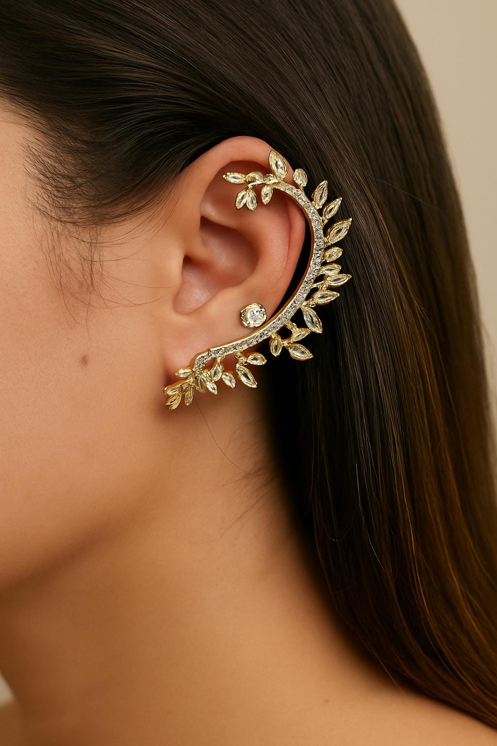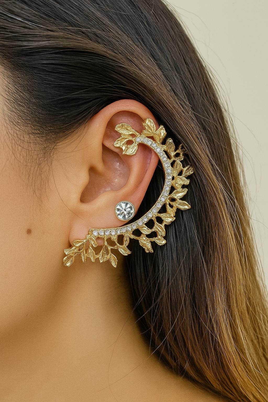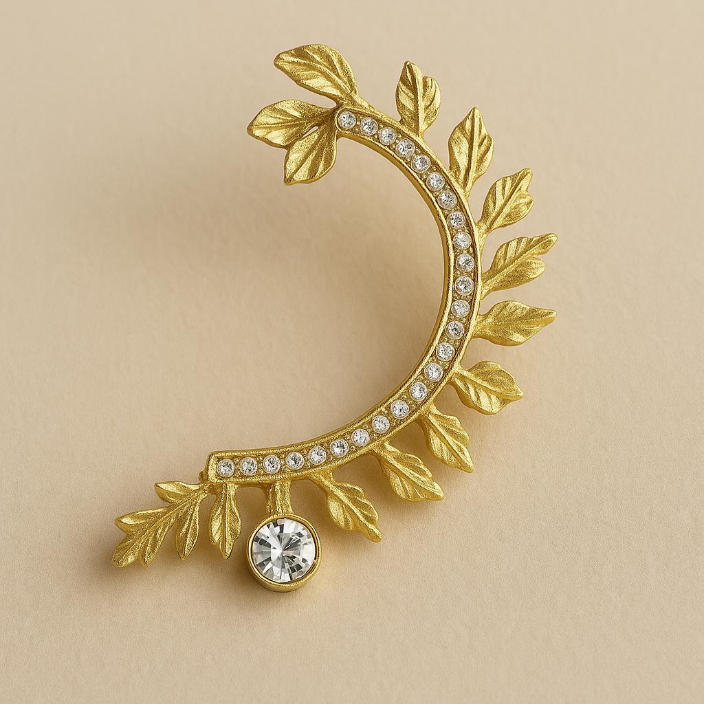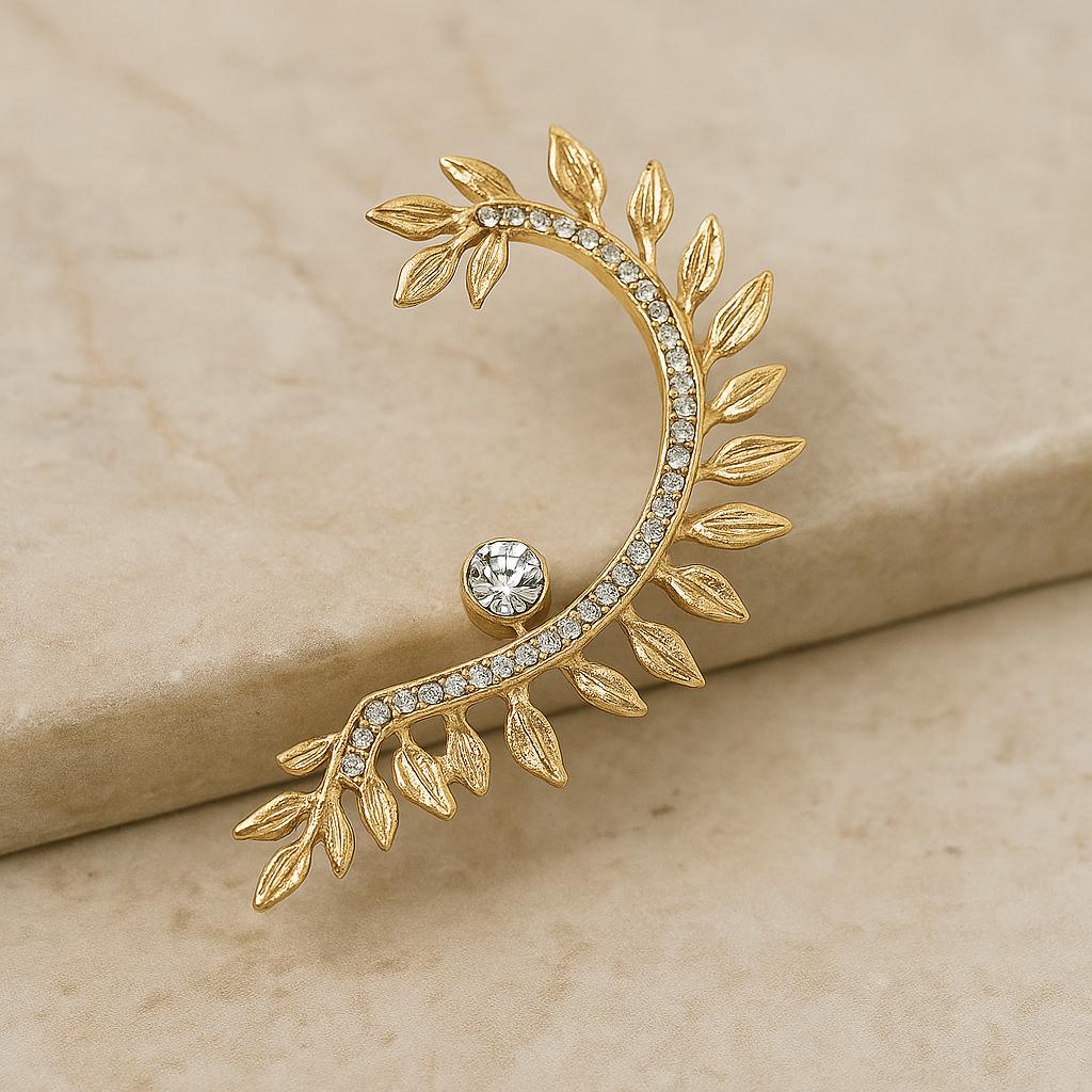 Make a statement with this stunning gold leaf ear cuff. Designed to gracefully hug the curve of your ear, this single-piece earring features a delicate vine pattern adorned with sparkling crystals. Whether you're dressing up for a special event or adding a touch of glam to your everyday look, this unique accessory is sure to stand out.