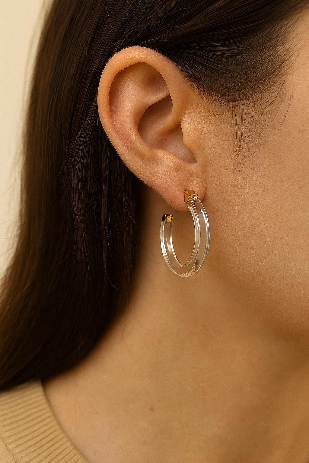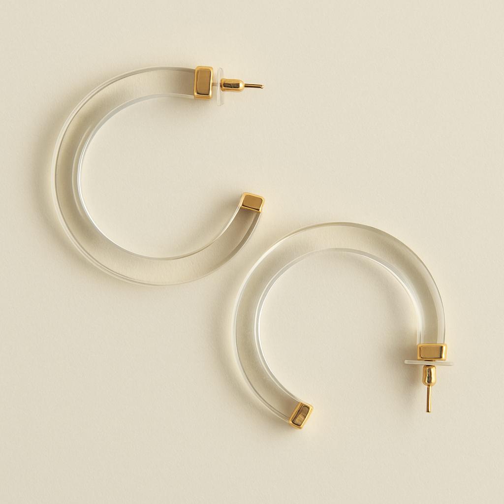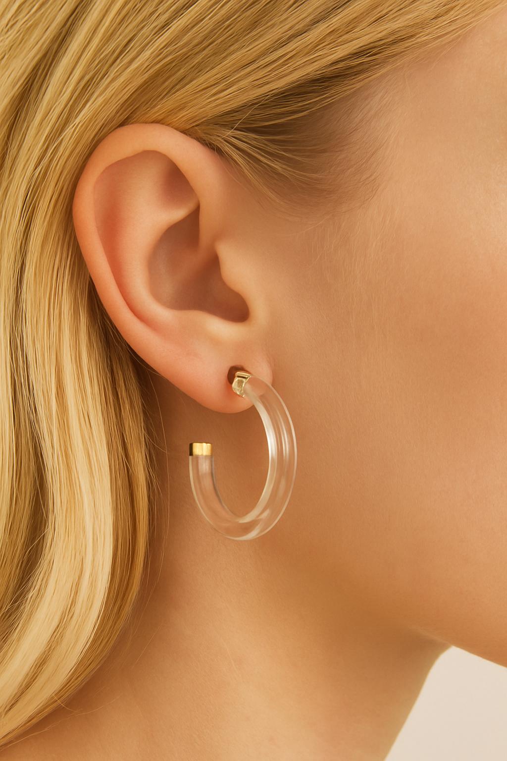 These clear acrylic hoop earrings are your go-to for modern, minimalist style. With a transparent resin body and elegant gold-tone metal tips, these lightweight hoops are perfect for elevating your everyday look — subtle yet bold.