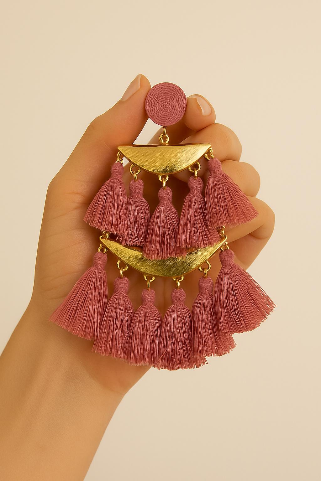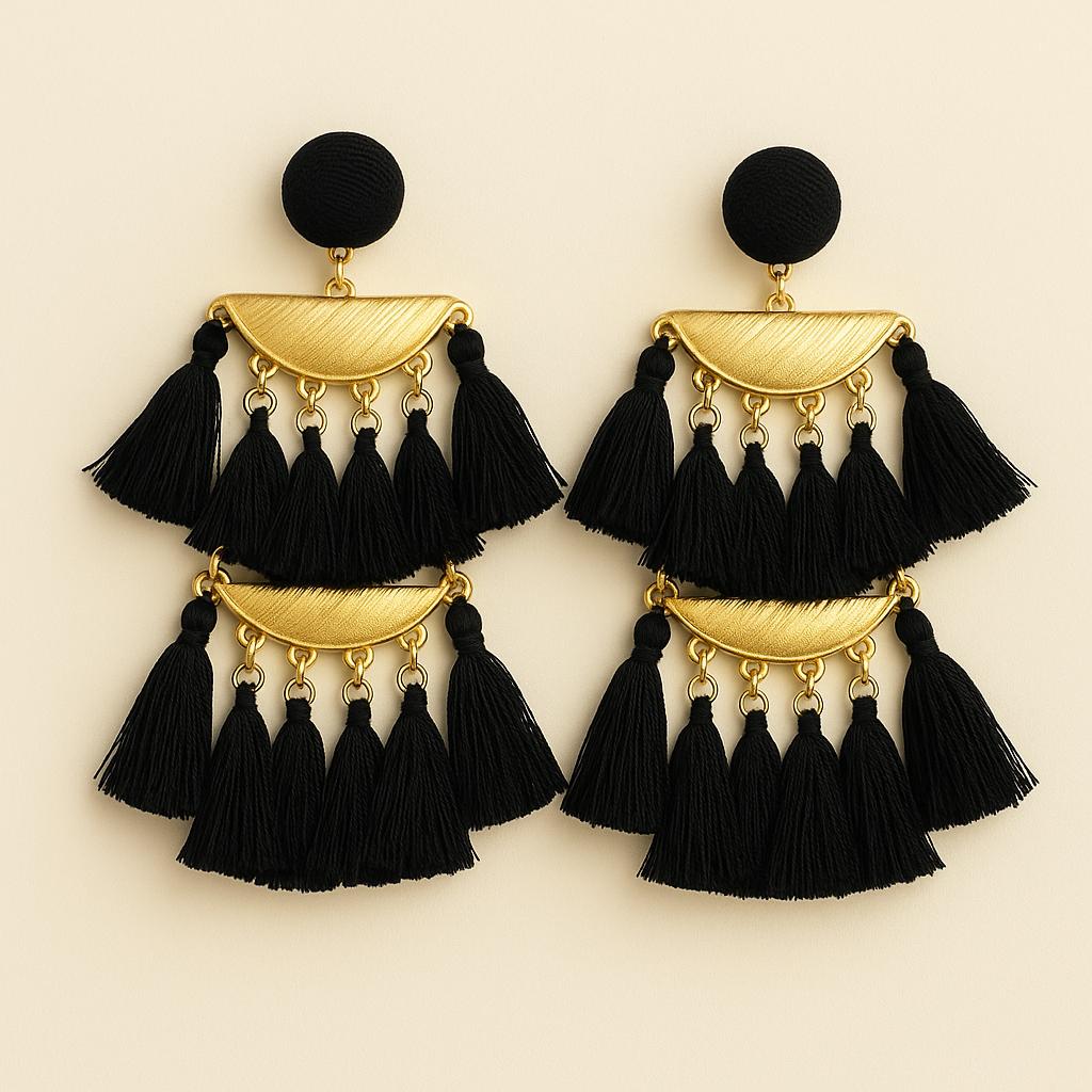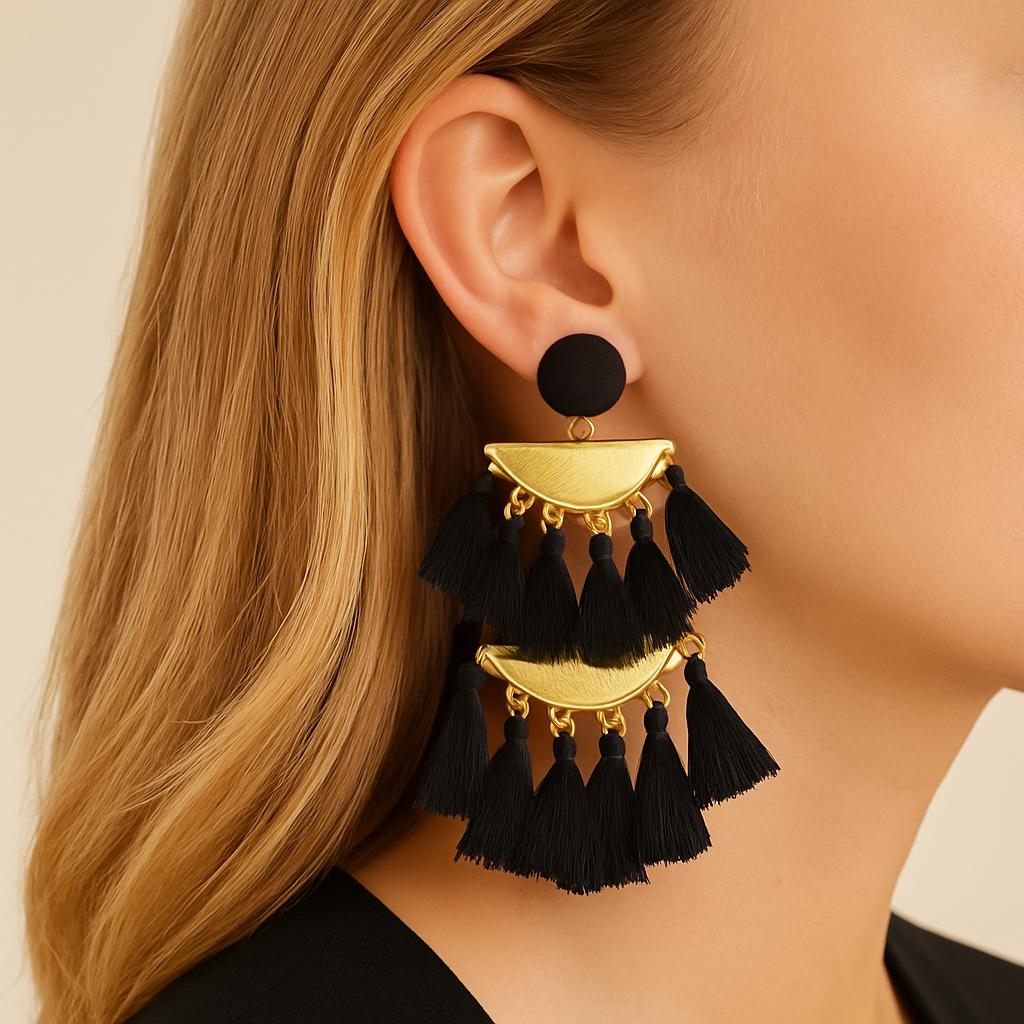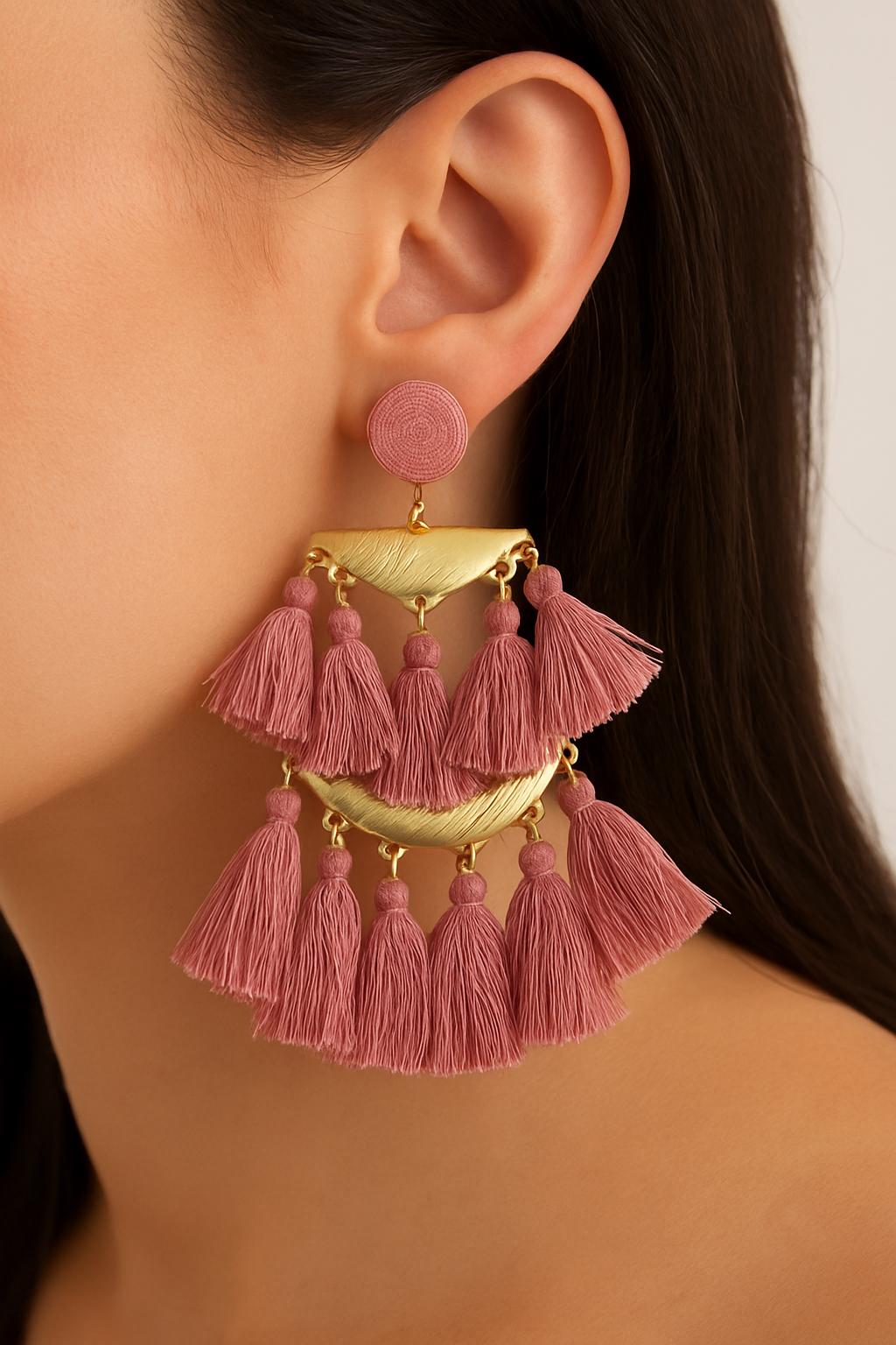 Make a bold statement with our handmade Boho Statement Tassel Earrings, available in Pink, Black, and White. These stunning earrings feature layered fringe tassels, elegant gold-tone hardware, and a lightweight feel for all-day comfort. Whether you're heading to a summer festival, brunch with friends, or just want to elevate your everyday look, these earrings add the perfect touch of bohemian glam.