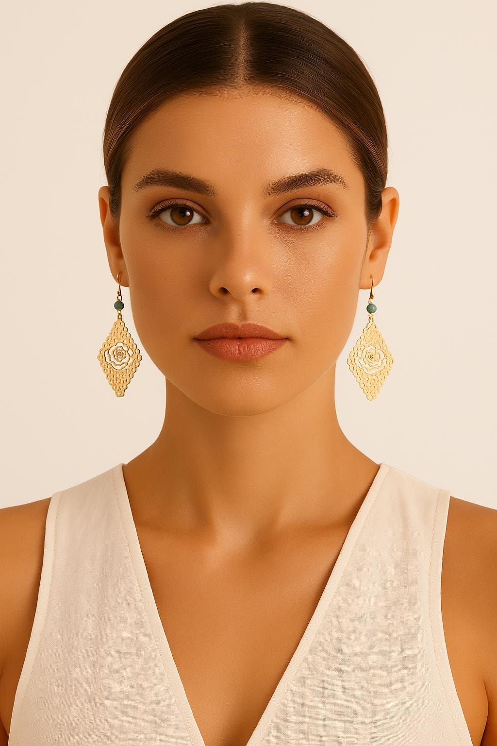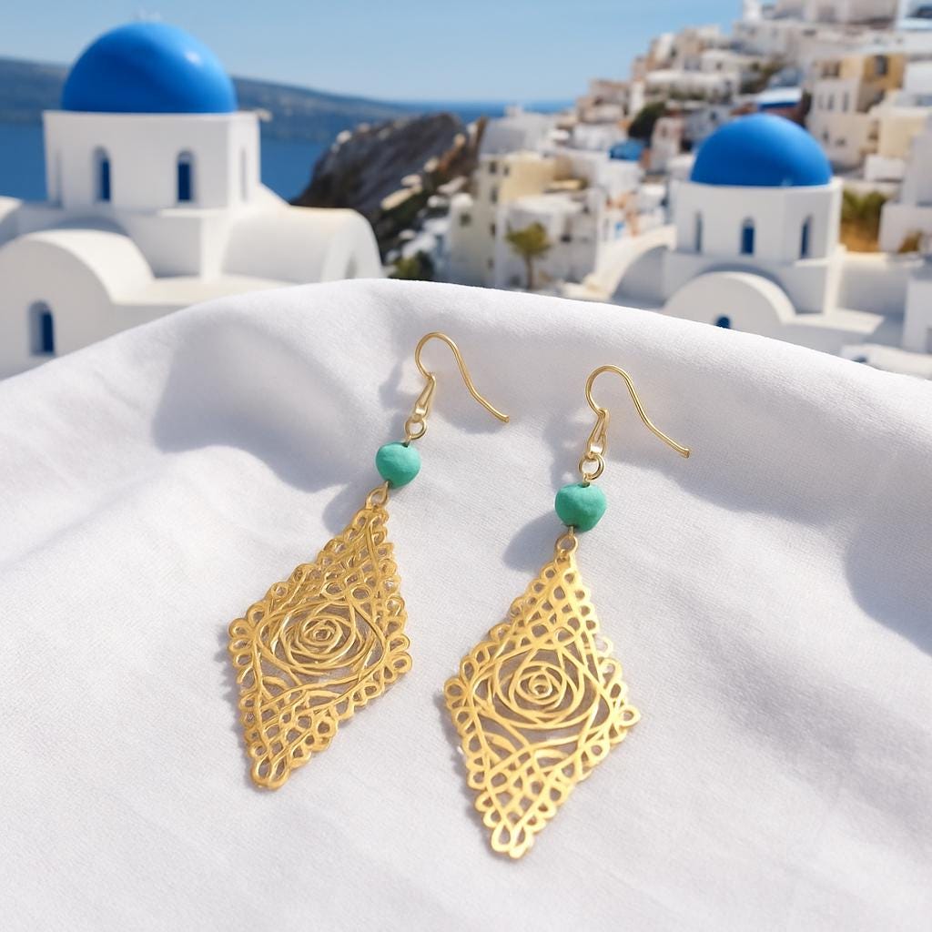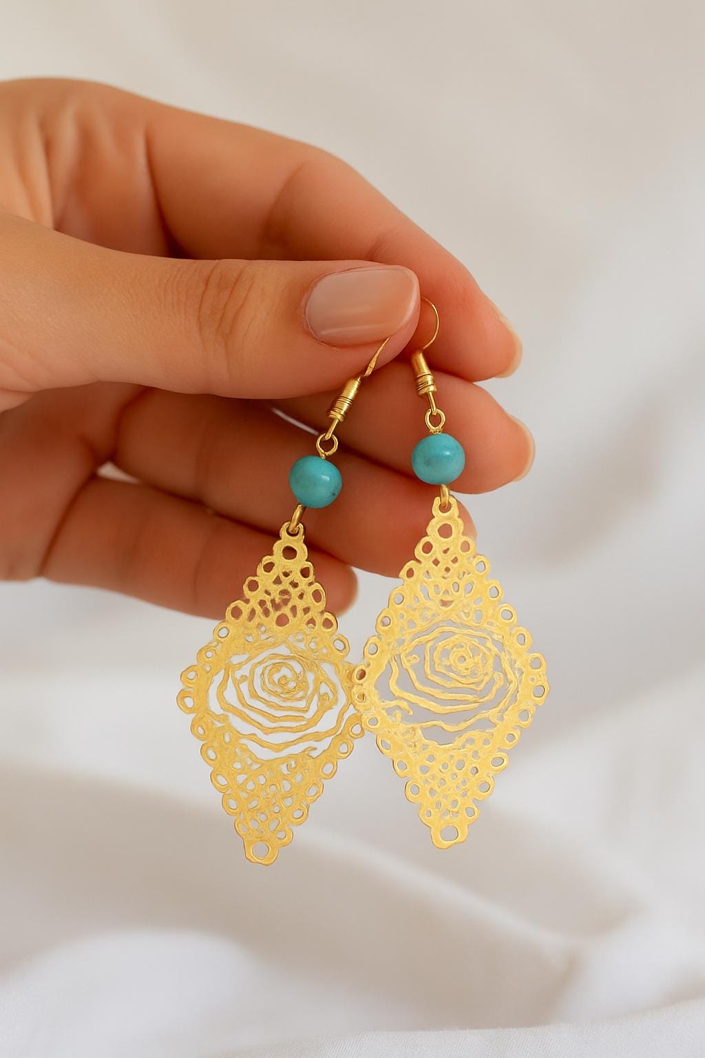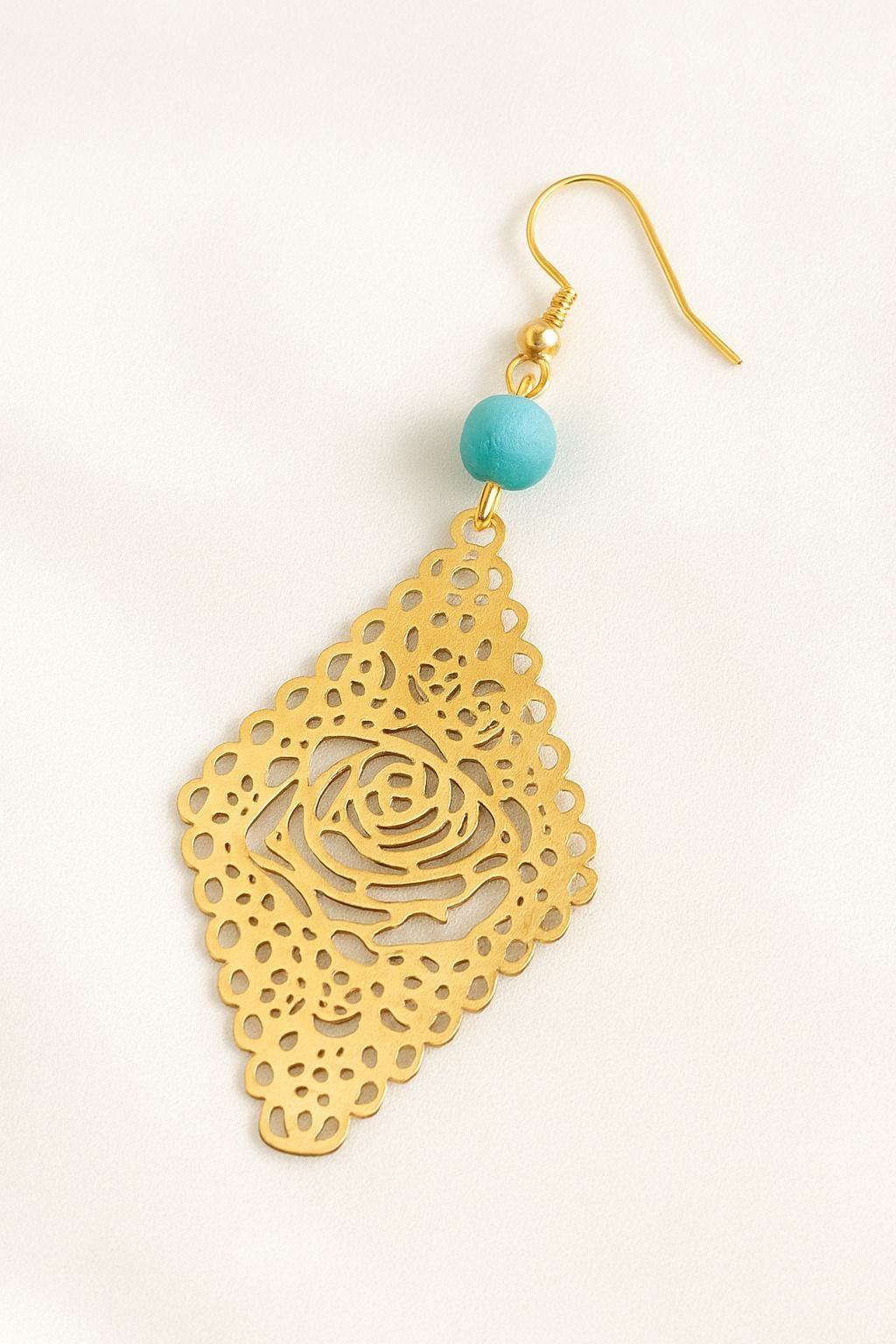 Add a touch of elegance and bohemian charm to your outfit with these lightweight gold rose cutout dangle earrings. Featuring a detailed floral filigree design and a turquoise accent bead, these earrings are perfect for everyday wear or special occasions. The delicate craftsmanship and bold silhouette make them a unique gift for her — ideal for birthdays, holidays, or just because.