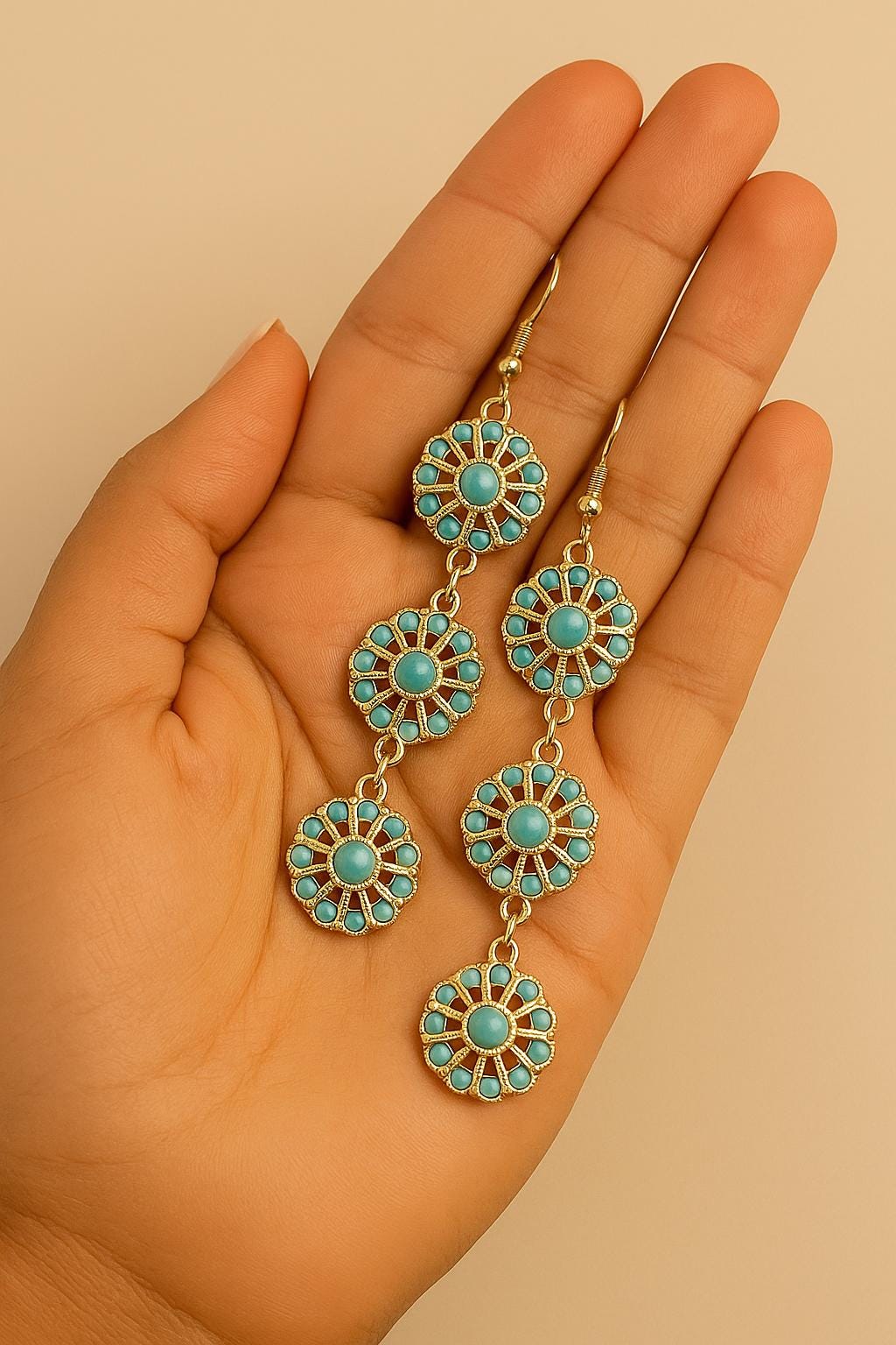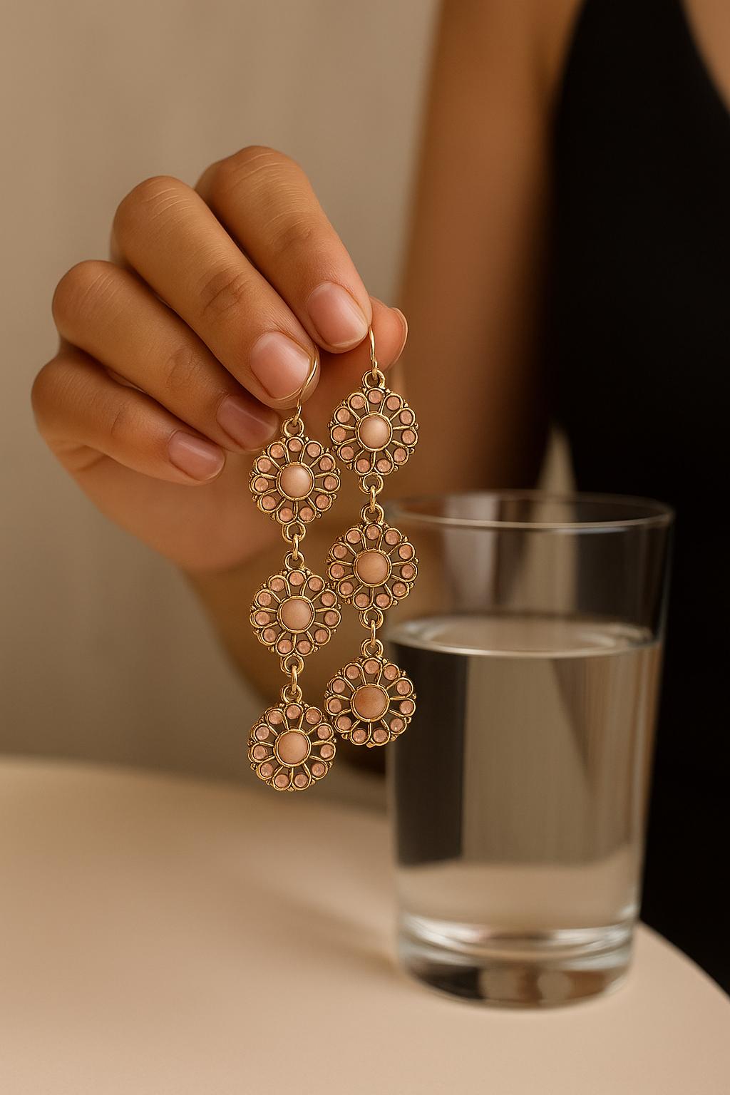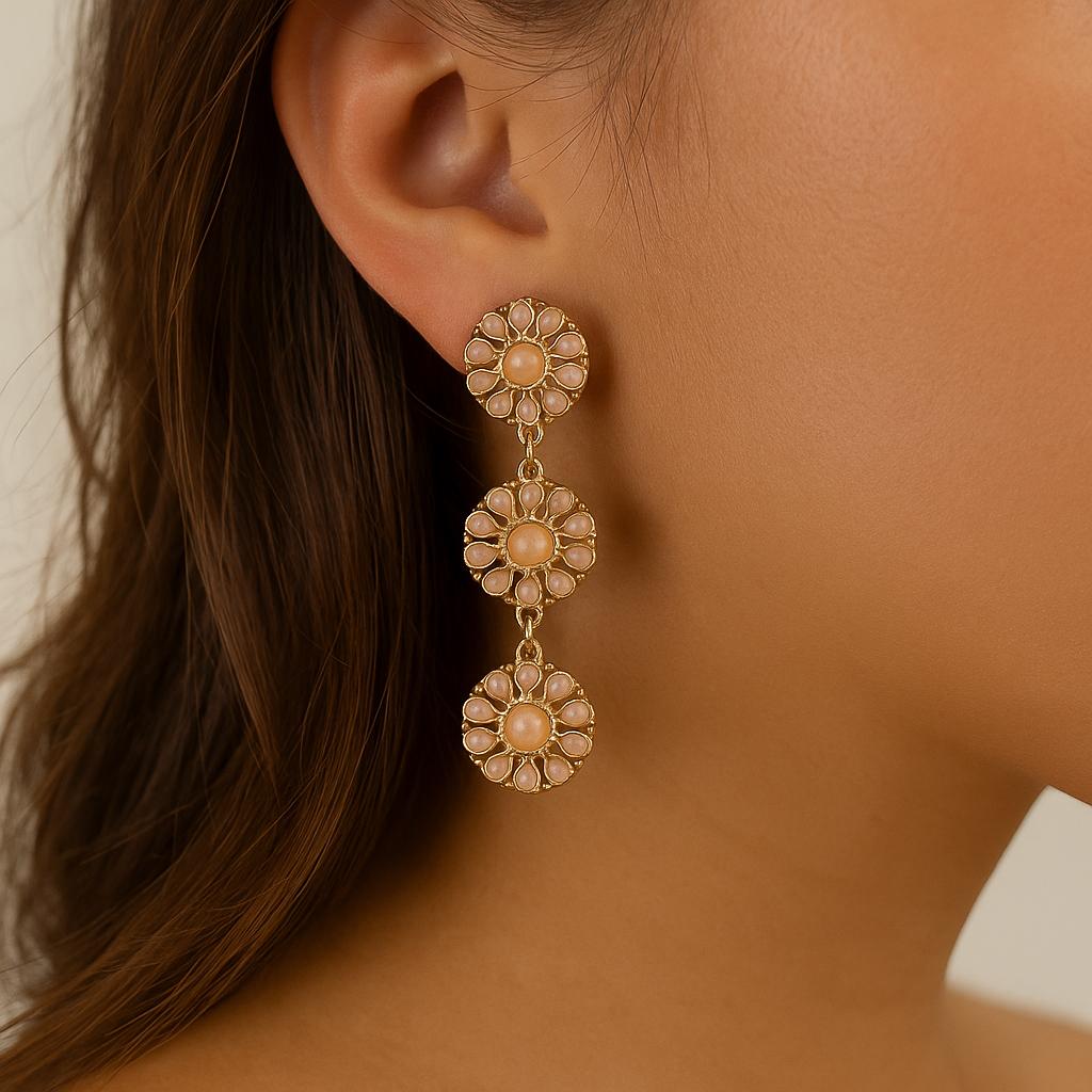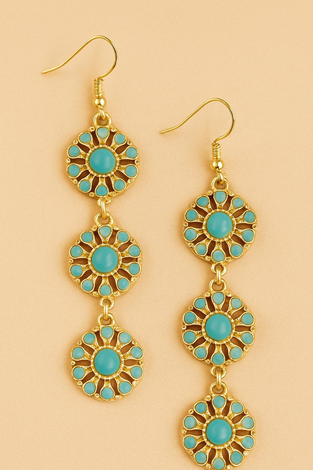 Elevate your everyday look with these stunning boho floral drop earrings, available in blush pink and turquoise blue. Each earring features a vintage-inspired daisy design with intricate petal detailing and a soft gold-tone finish that adds a touch of elegance.