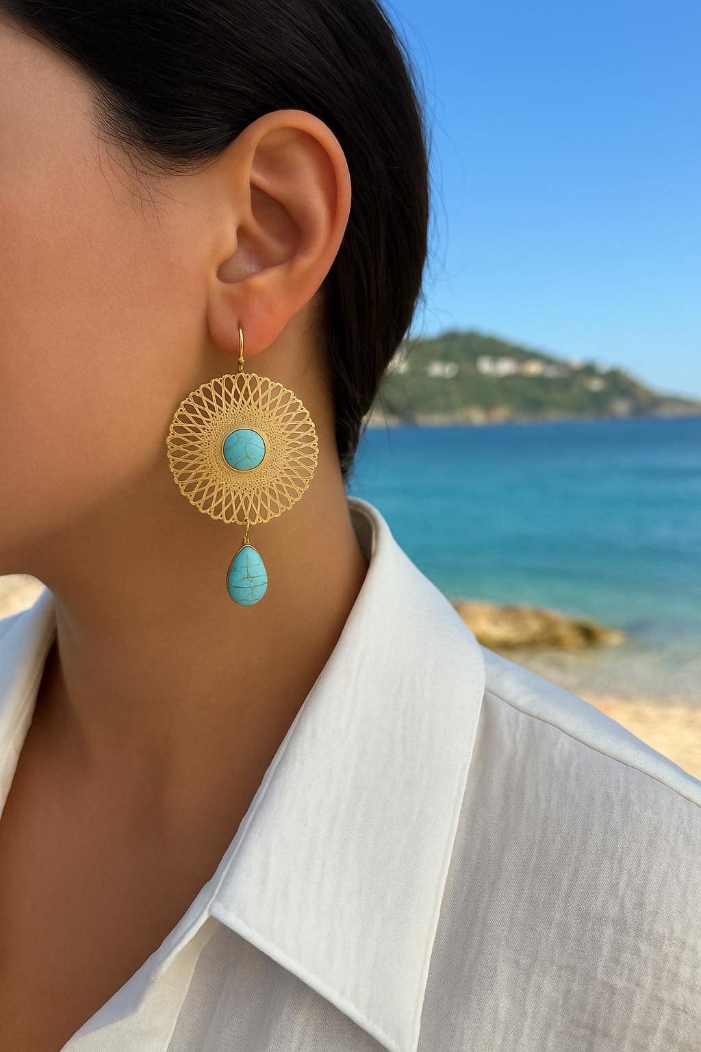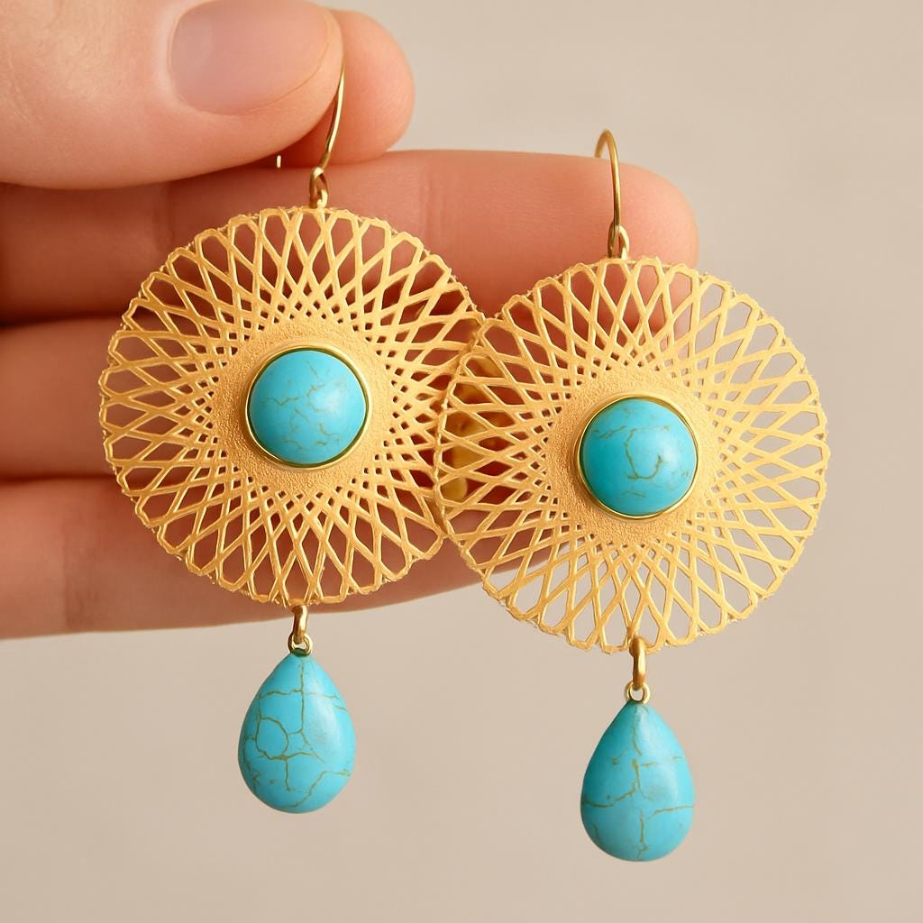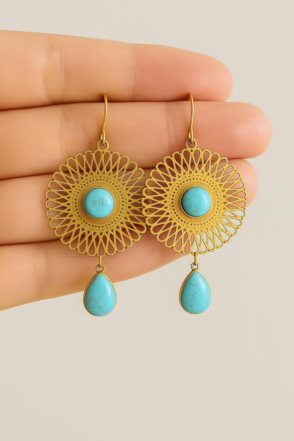 Elevate your boho-chic style with these beautifully handcrafted brass mandala earrings featuring a turquoise teardrop charm. Lightweight yet eye-catching, these earrings are perfect for festivals, summer events, or adding a pop of color to your everyday look.