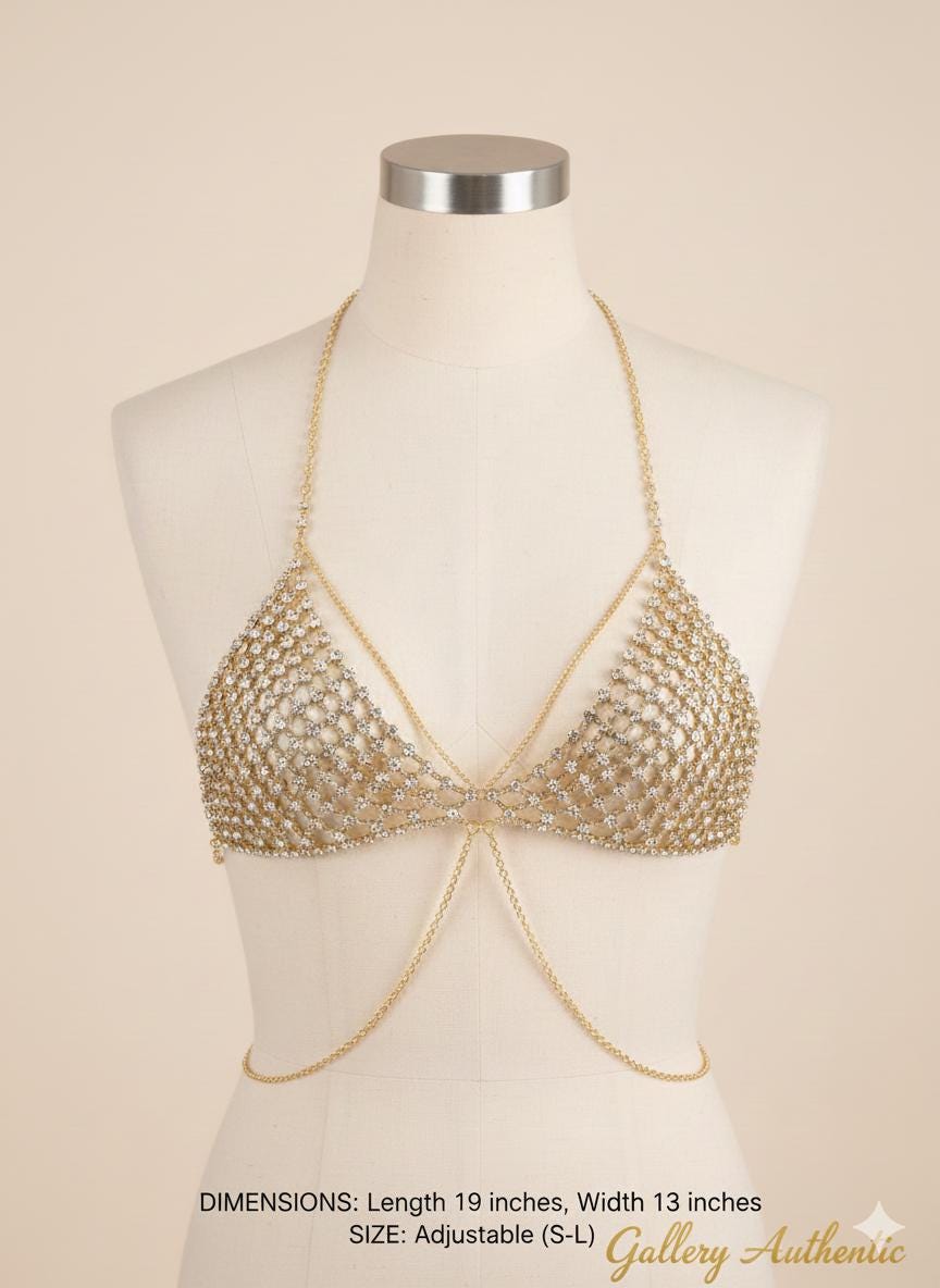Elevate your look with our stunning Gold Plated Rhinestone Body Chain. Exclusively designed by Gallery Authentic to add a touch of luxury and bold elegance to any outfit. Handcrafted with high-quality gold plating and shimmering crystal stones, this piece is engineered to catch the light from every angle—whether you're under the sun or the club lights.