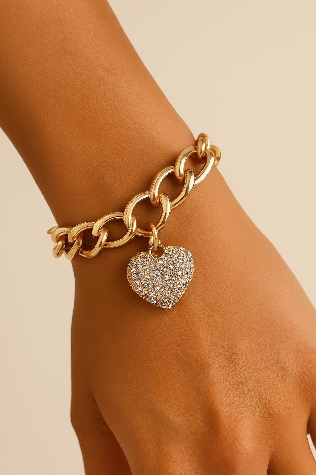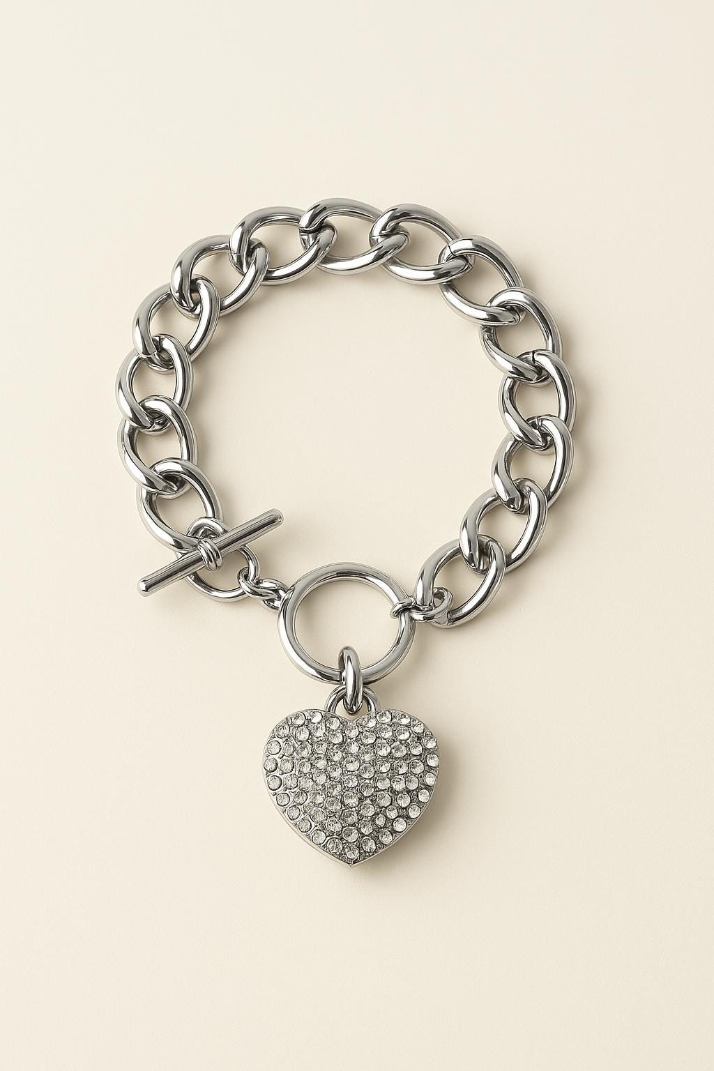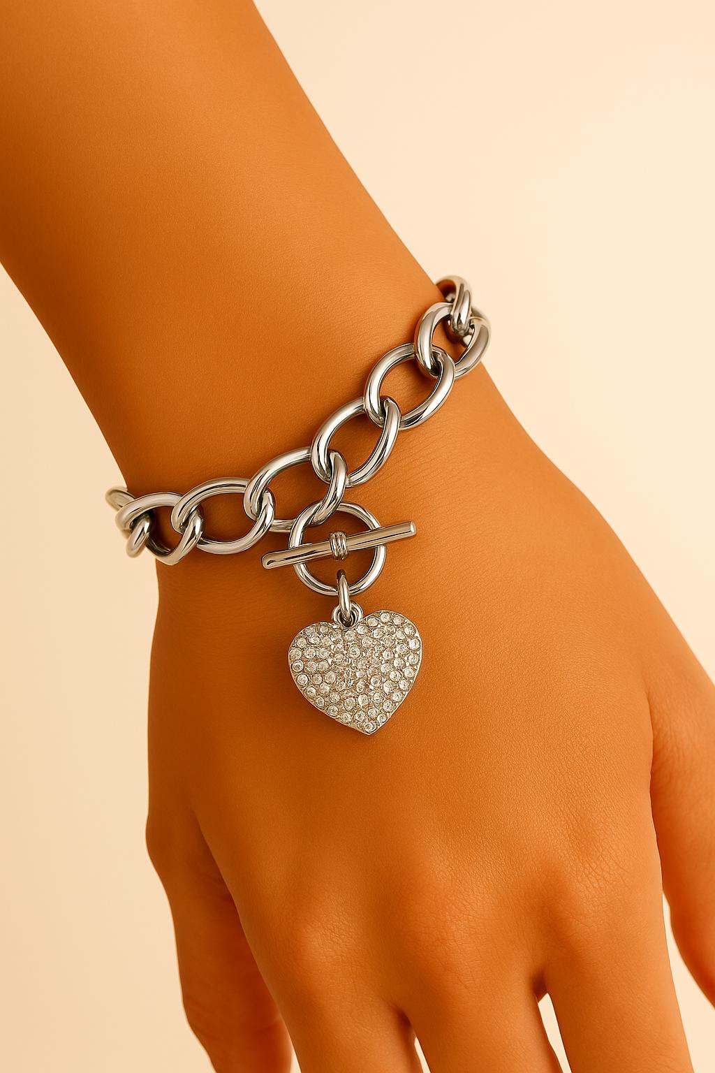 Add a touch of bold elegance to your style with this stunning silver heart charm bracelet. Featuring a chunky link chain and a sparkling rhinestone heart pendant, this bracelet is the perfect accessory for any outfit — from casual daytime looks to evening glam.