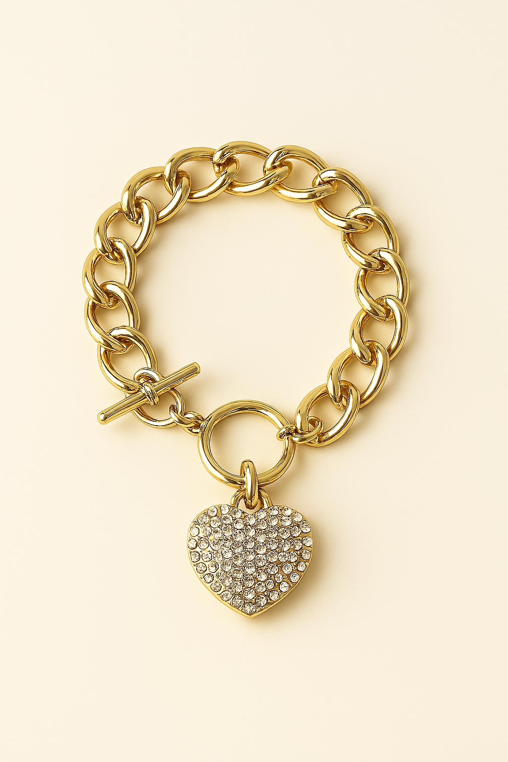Make a bold statement with this gorgeous chunky gold bracelet featuring a sparkling heart lock charm encrusted with shimmering crystals.