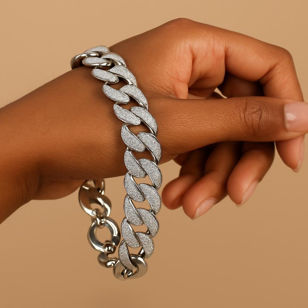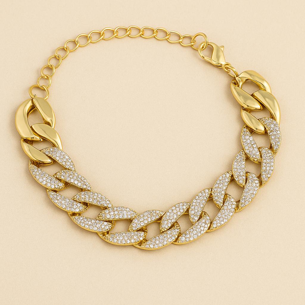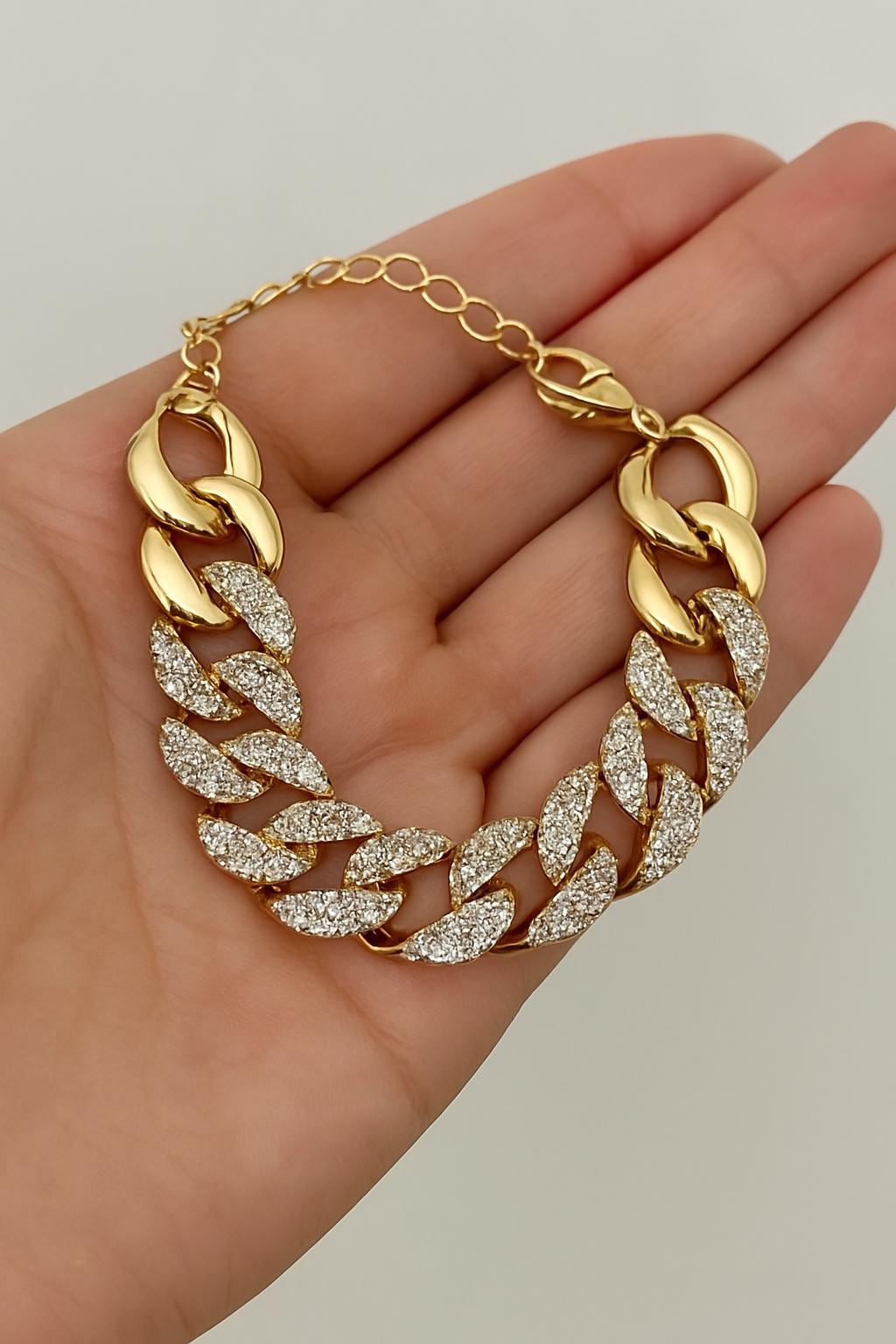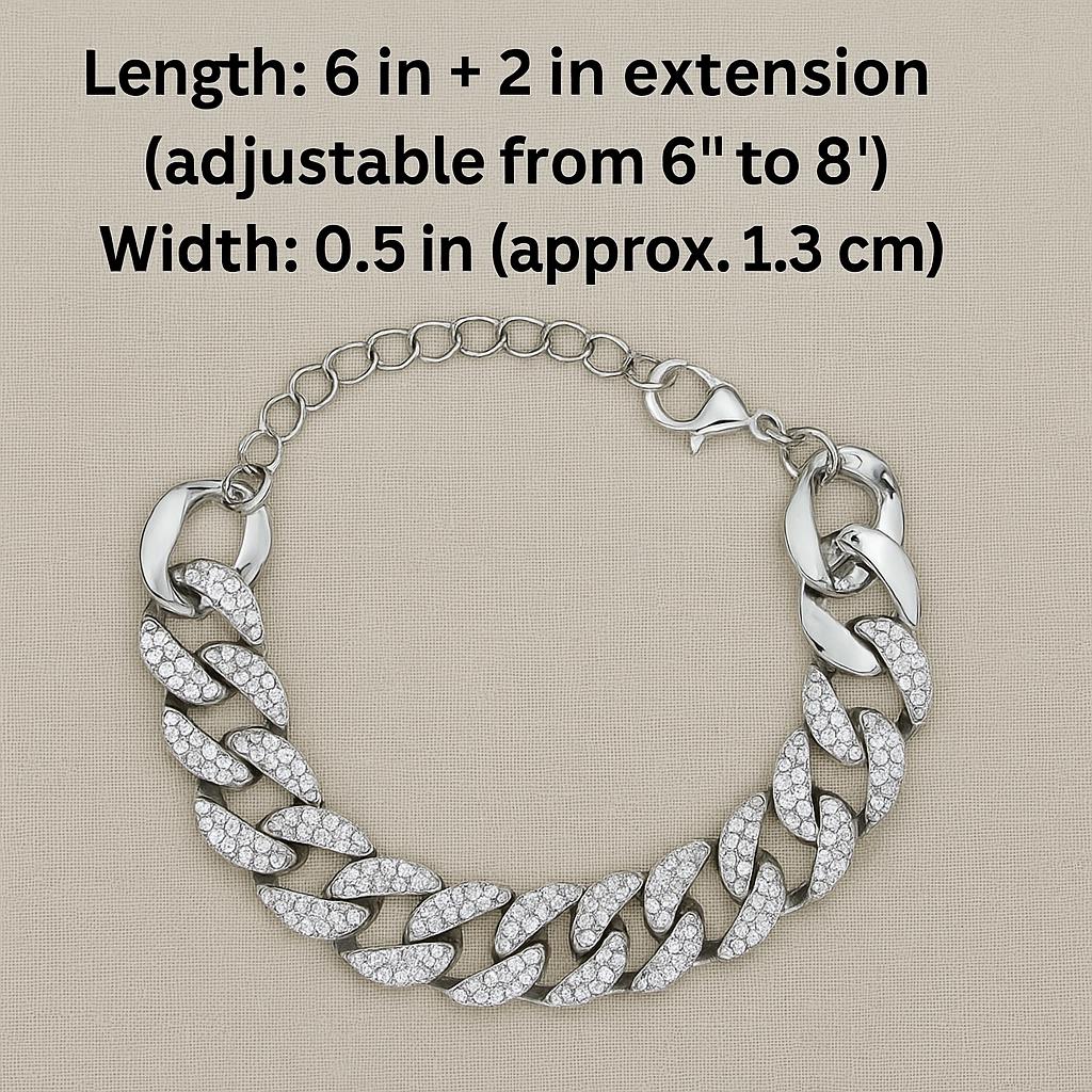 Make a bold and glamorous statement with this stunning Cuban link chain bracelet. Featuring alternating high-shine gold links and crystal-covered segments, this piece is the perfect blend of edgy and elegant. The adjustable extension chain ensures a comfortable fit for all wrist sizes. Whether you're dressing up for a night out or adding sparkle to your everyday style, this bracelet is a head-turning accessory you'll love to wear.