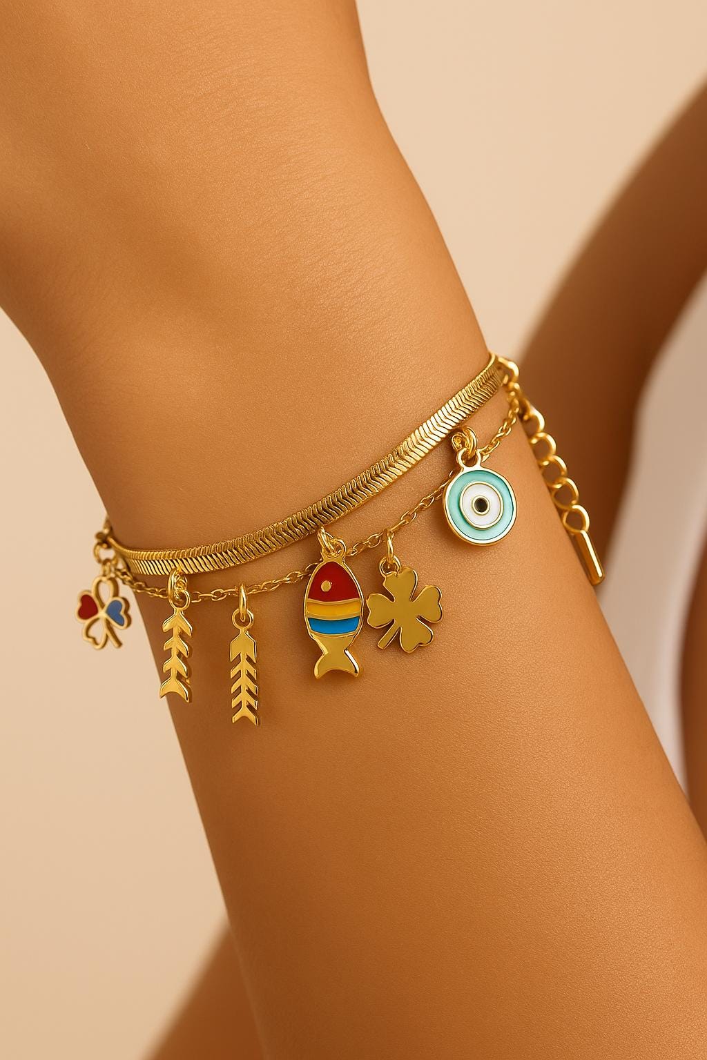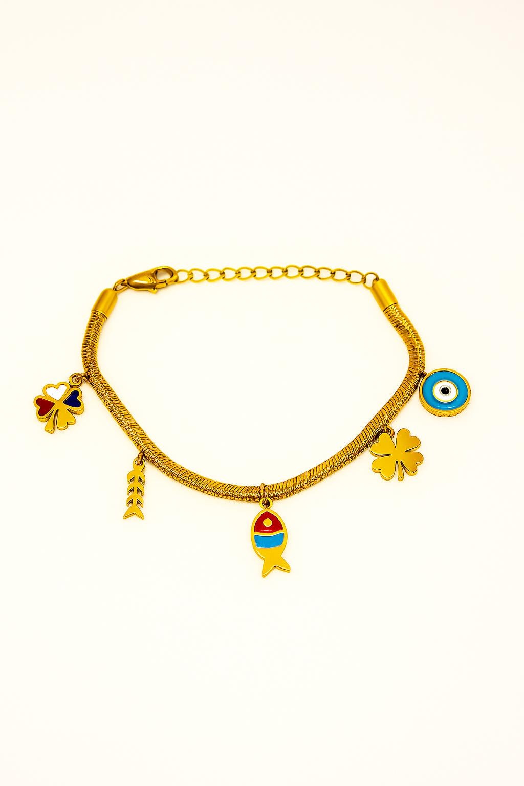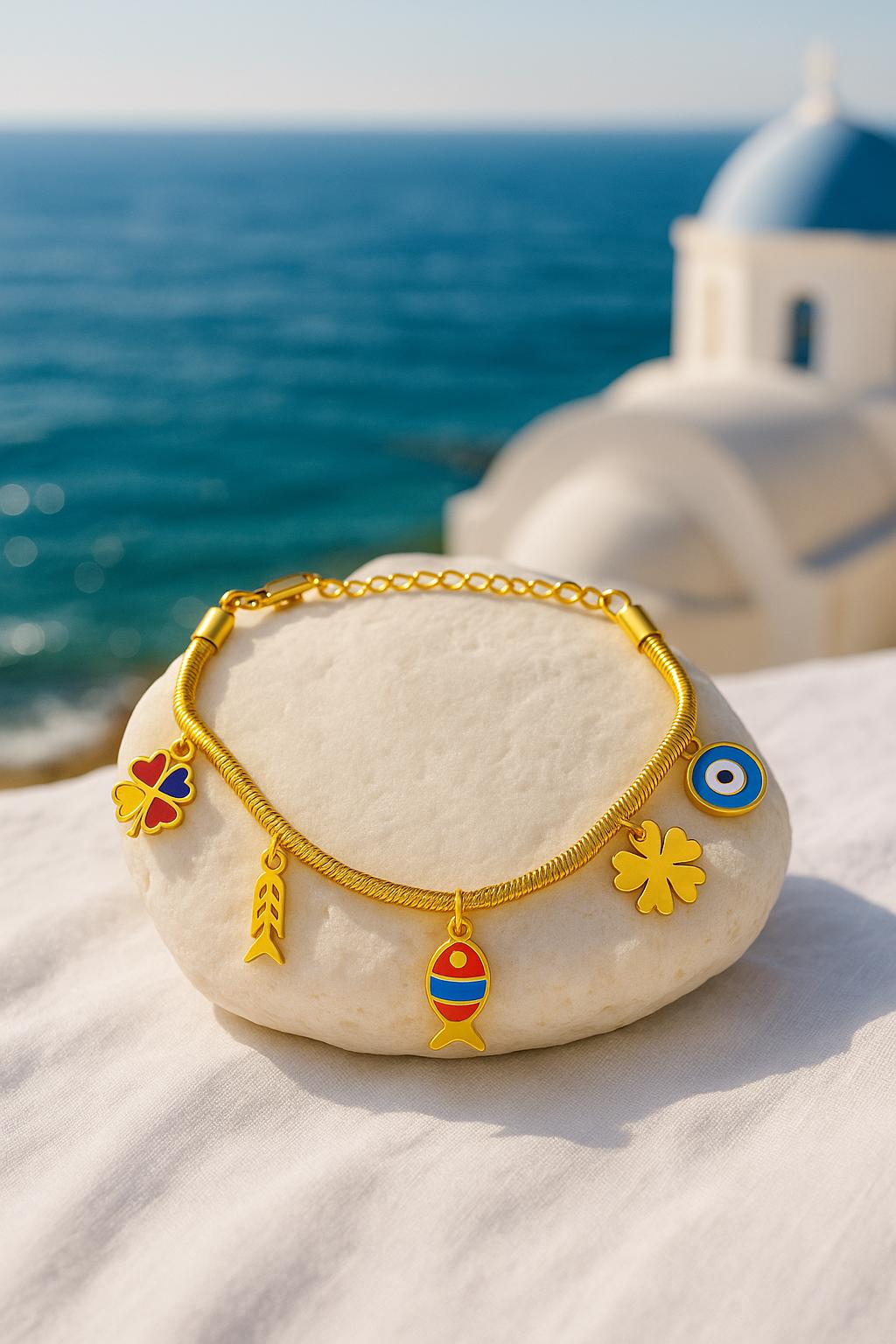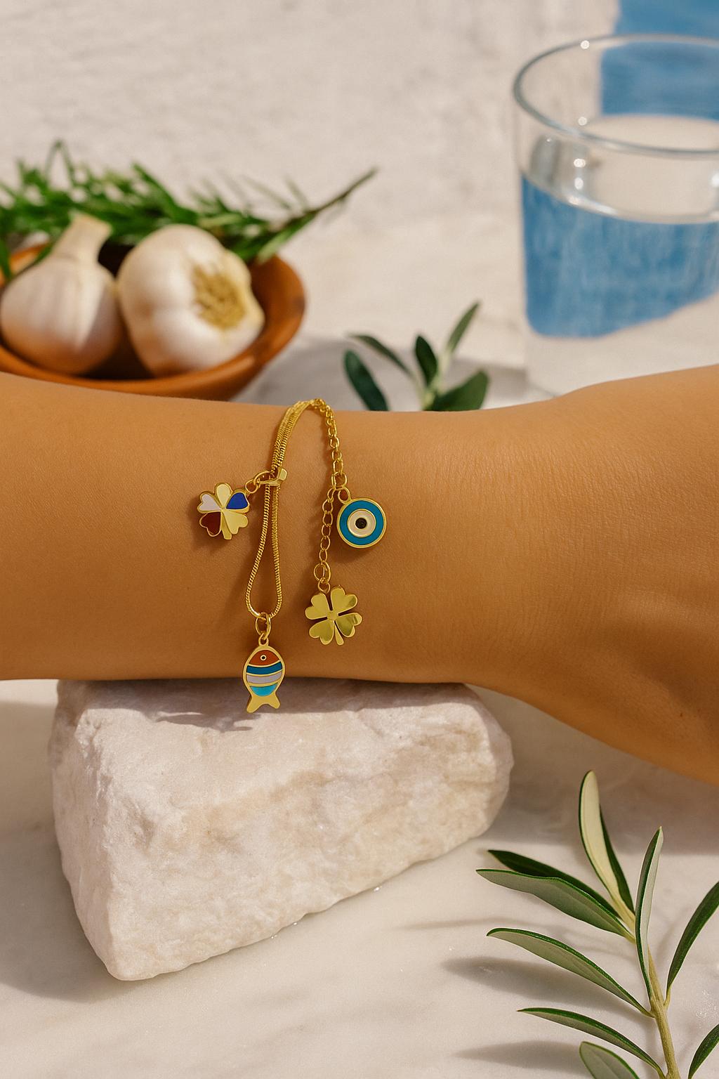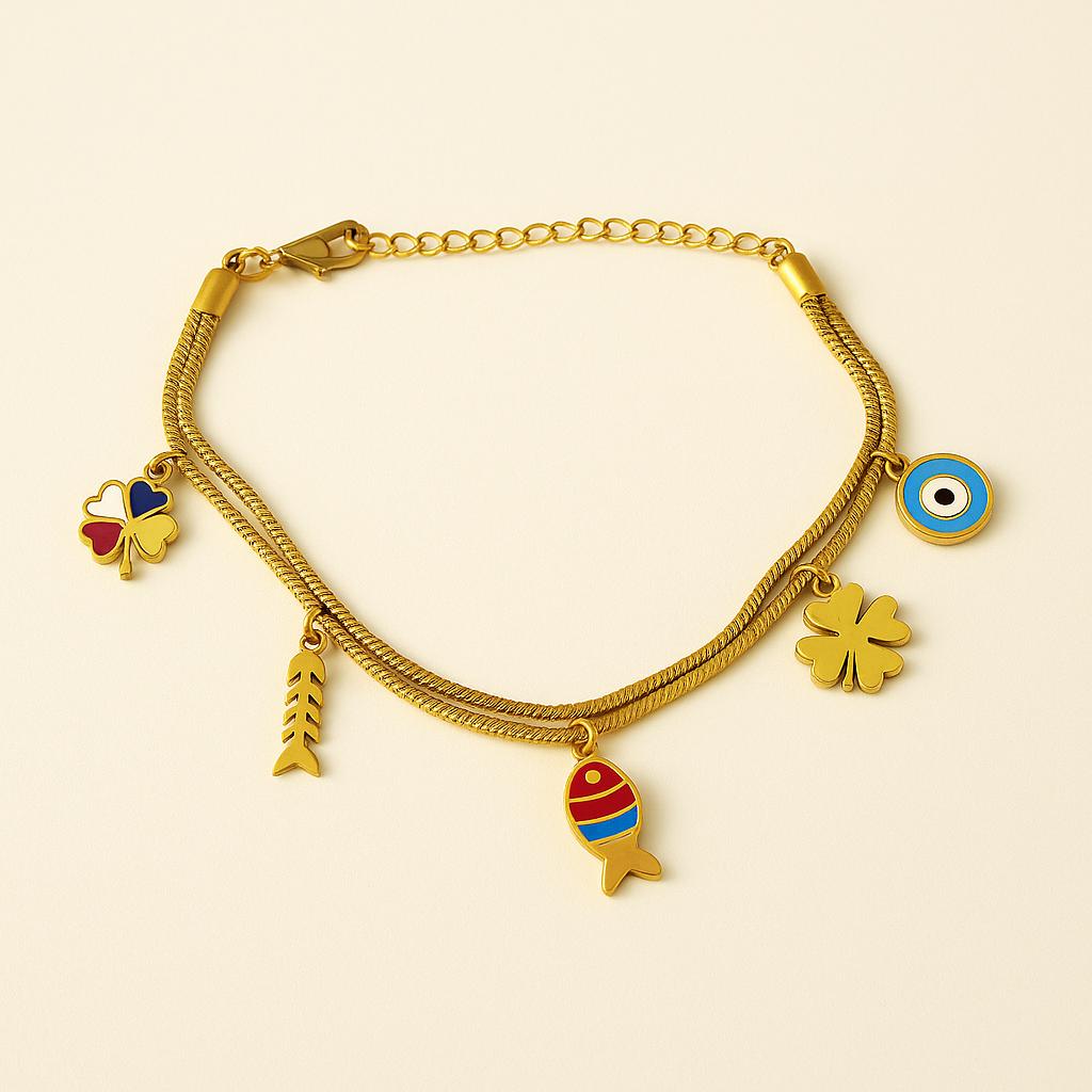 Add a playful touch of charm to your everyday style with this colorful gold bracelet featuring five unique lucky symbols: evil eye, heart, clover, fish, and arrow. Crafted with high-quality gold-toned metal and colorful enamel accents, this piece is both meaningful and eye-catching. The adjustable chain ensures a perfect fit for all wrist sizes, making it a great gift for someone special or a fun treat for yourself.