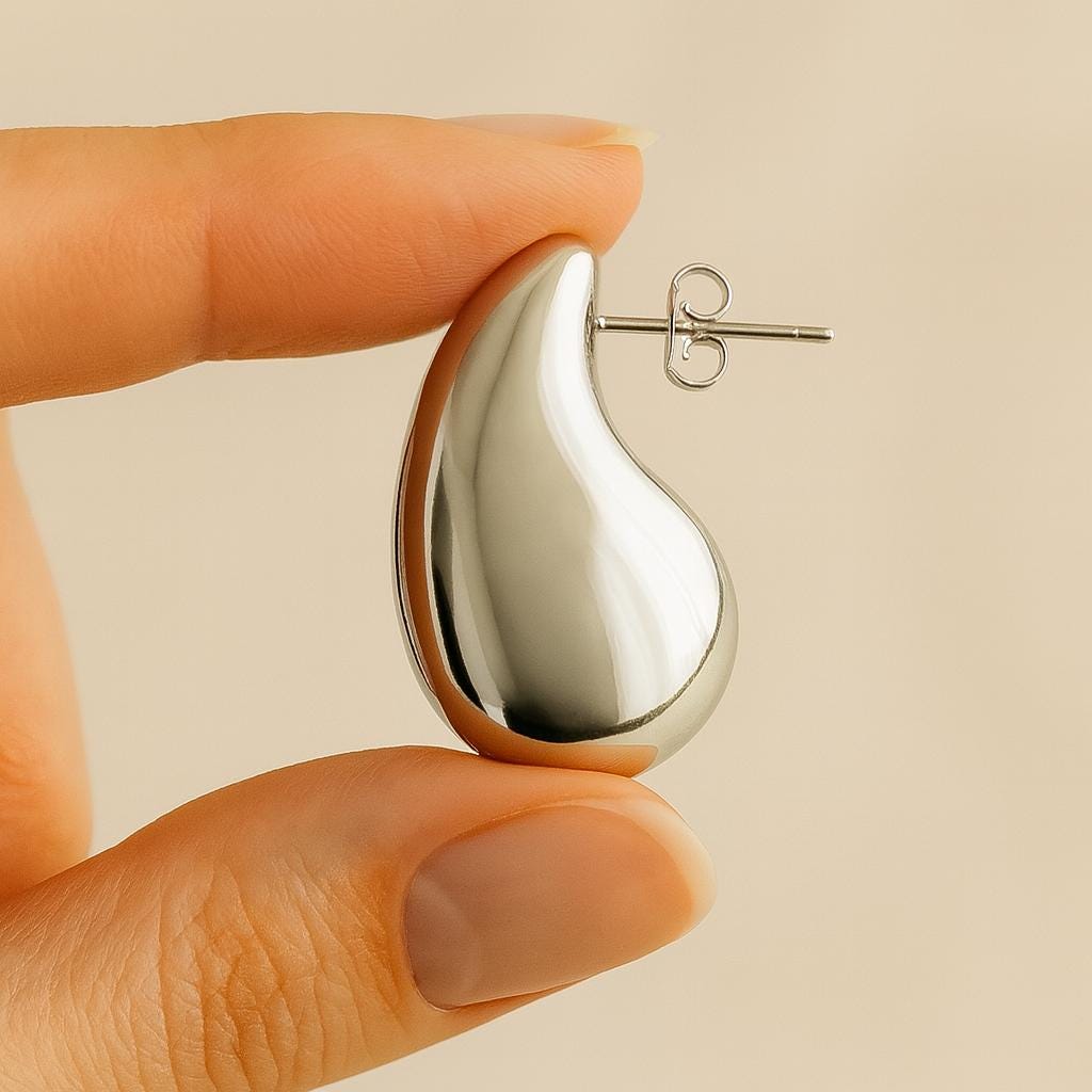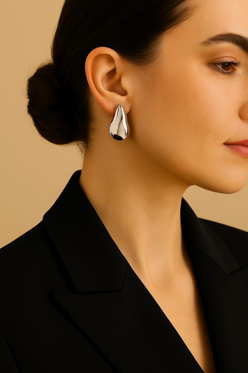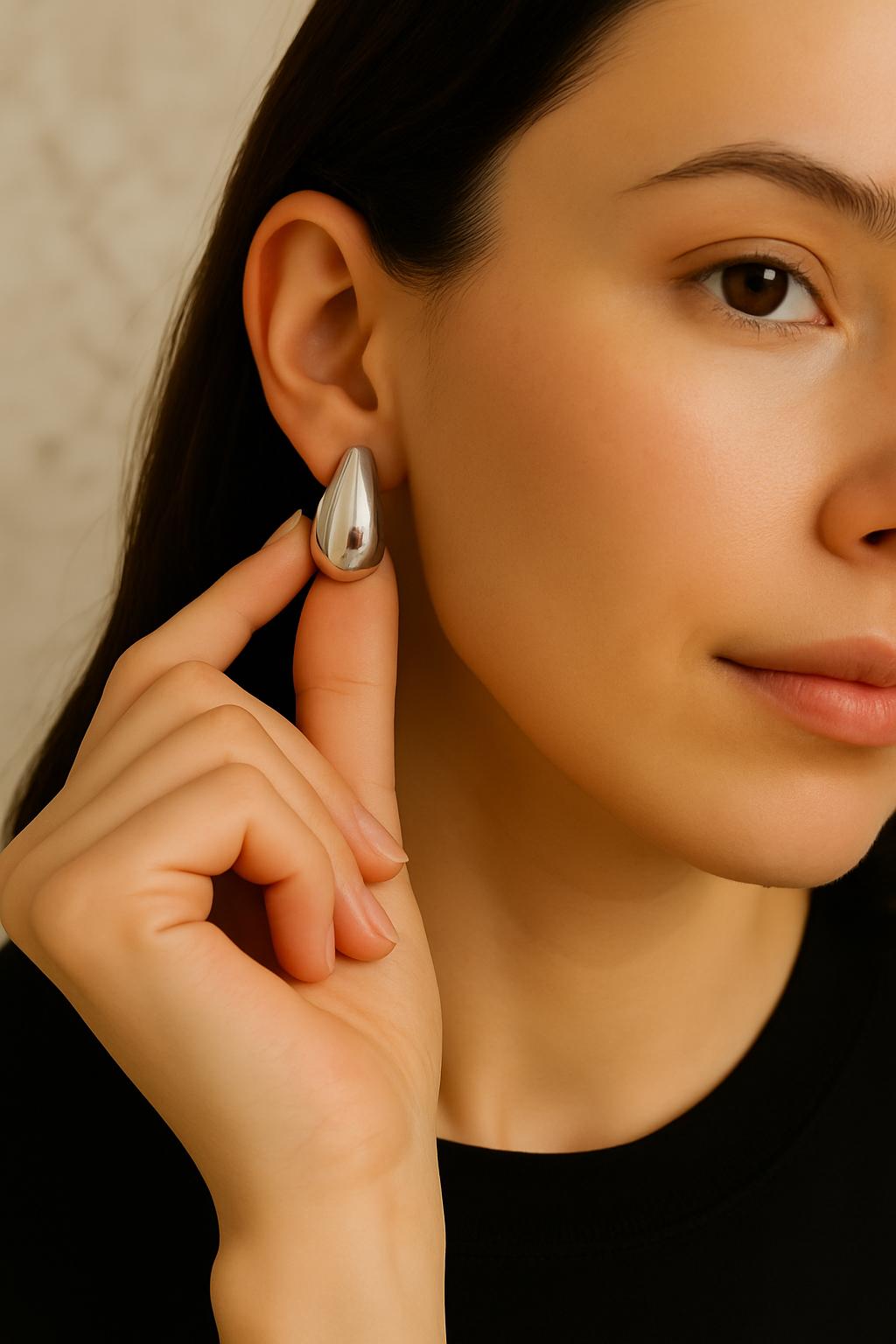 These Silver Water Drop Earrings feature a smooth, fluid teardrop shape that adds an effortless modern elegance to any outfit. Their sculptural, reflective surface catches the light beautifully, making them a standout accessory for both day and night looks.