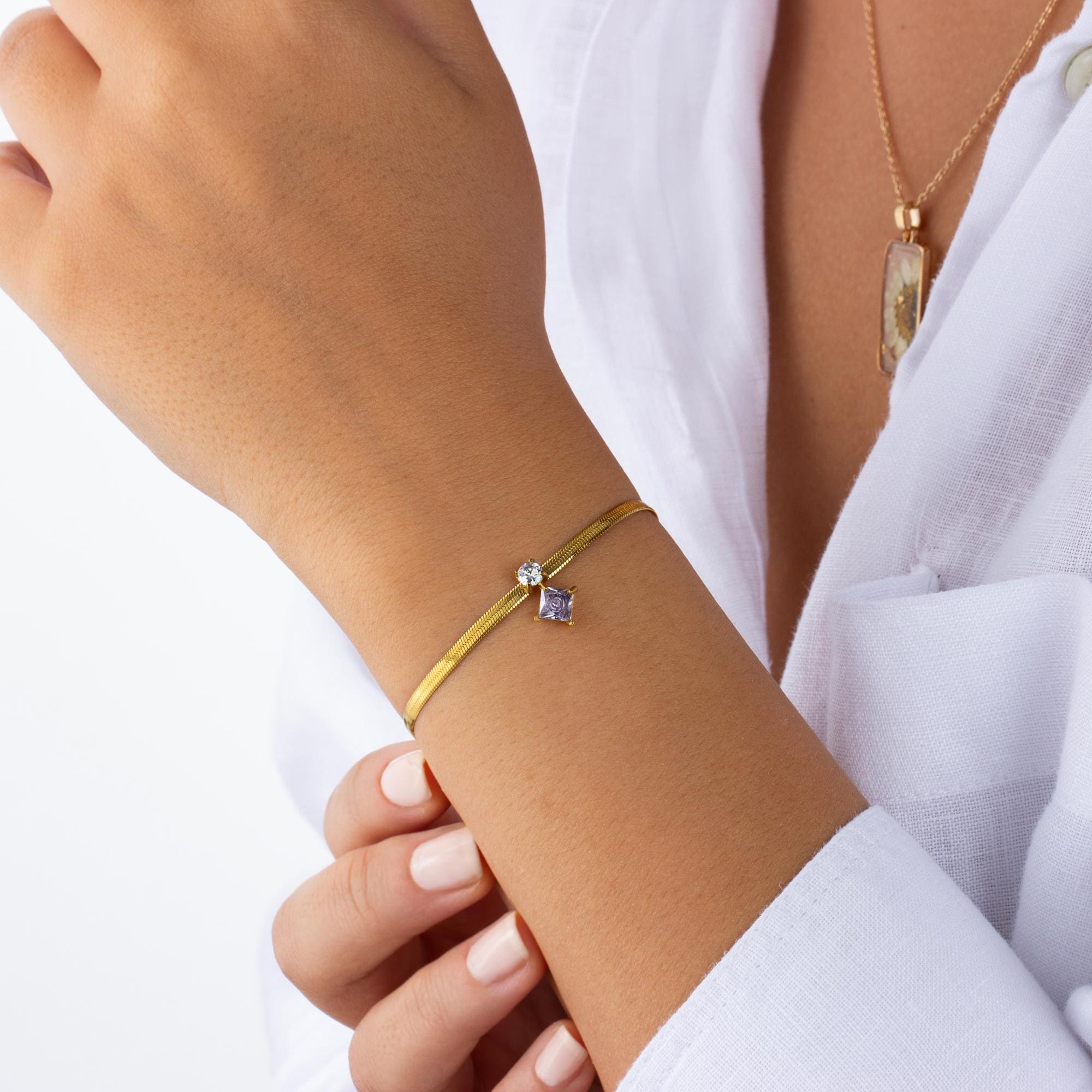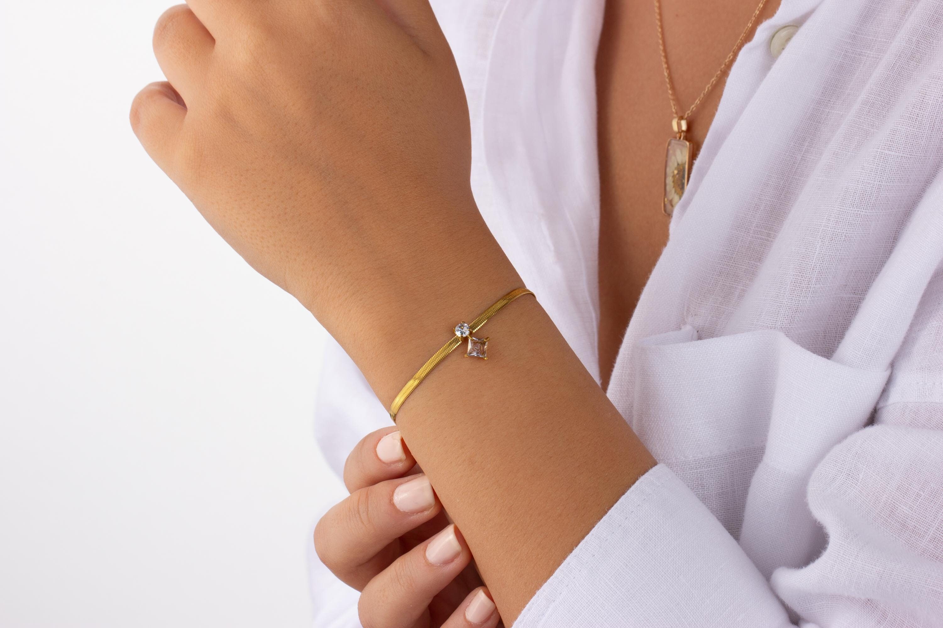 Add a touch of elegance to your everyday look with this stunning handmade gold-plated flat snake chain bracelet, featuring two dazzling zirconia stones. Crafted with care, this piece blends sophistication with minimalism, making it perfect for any occasion.