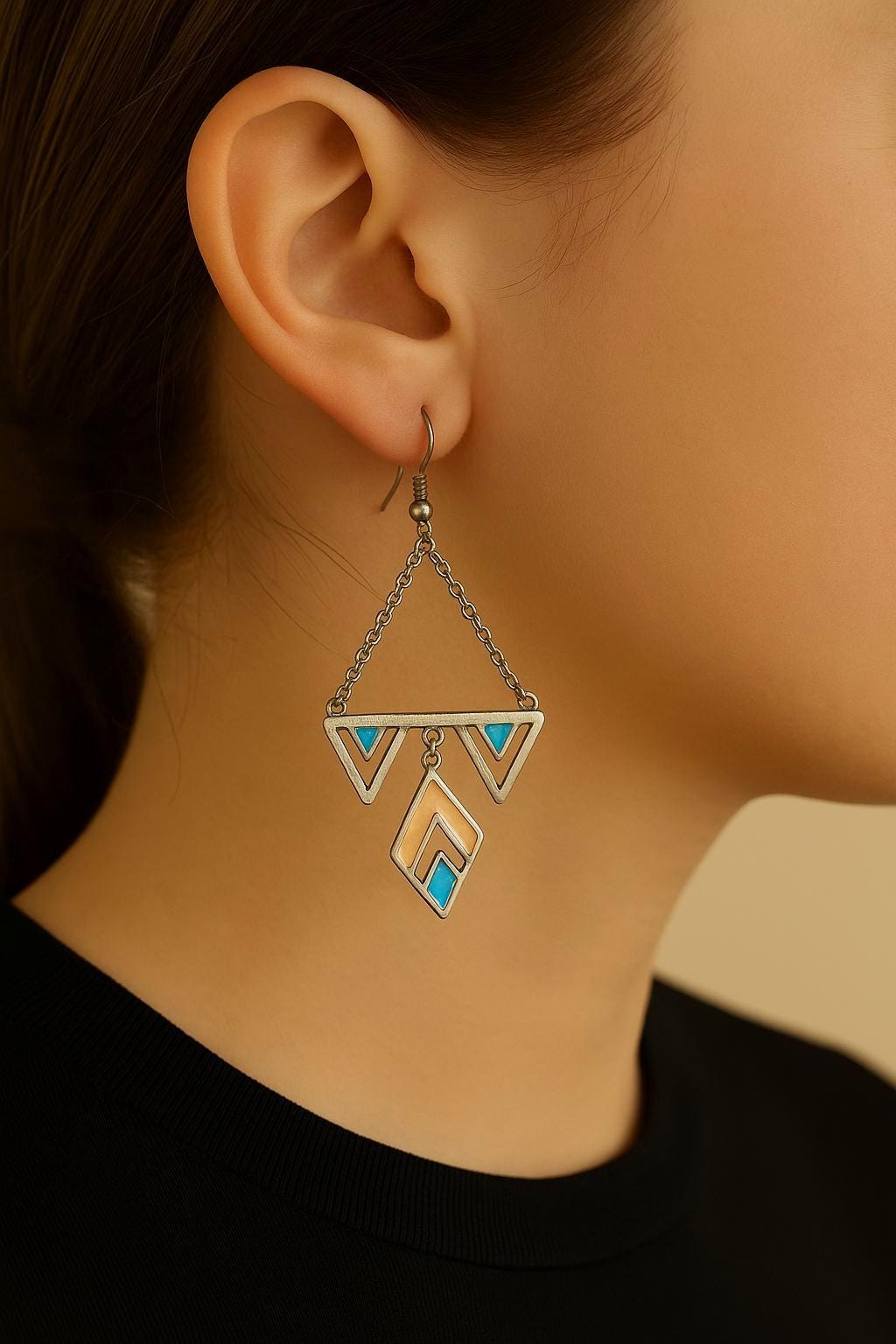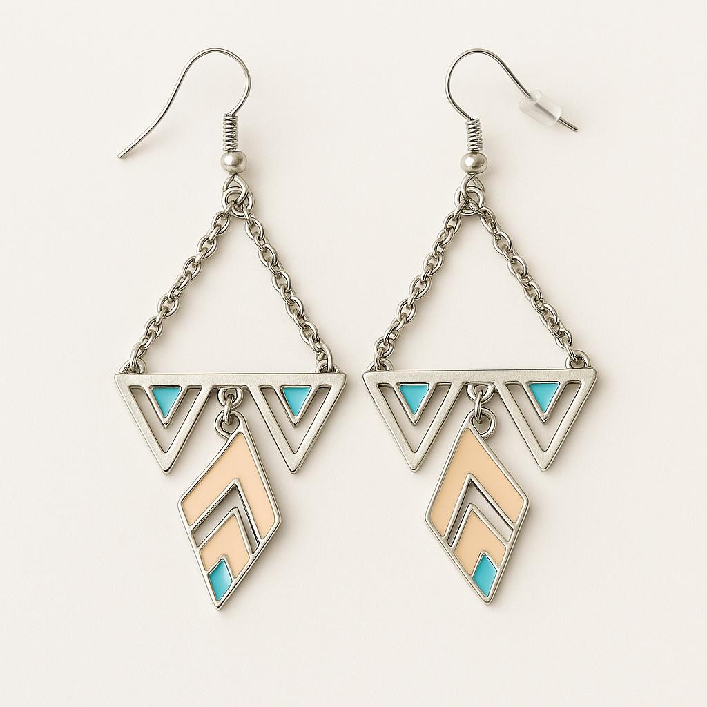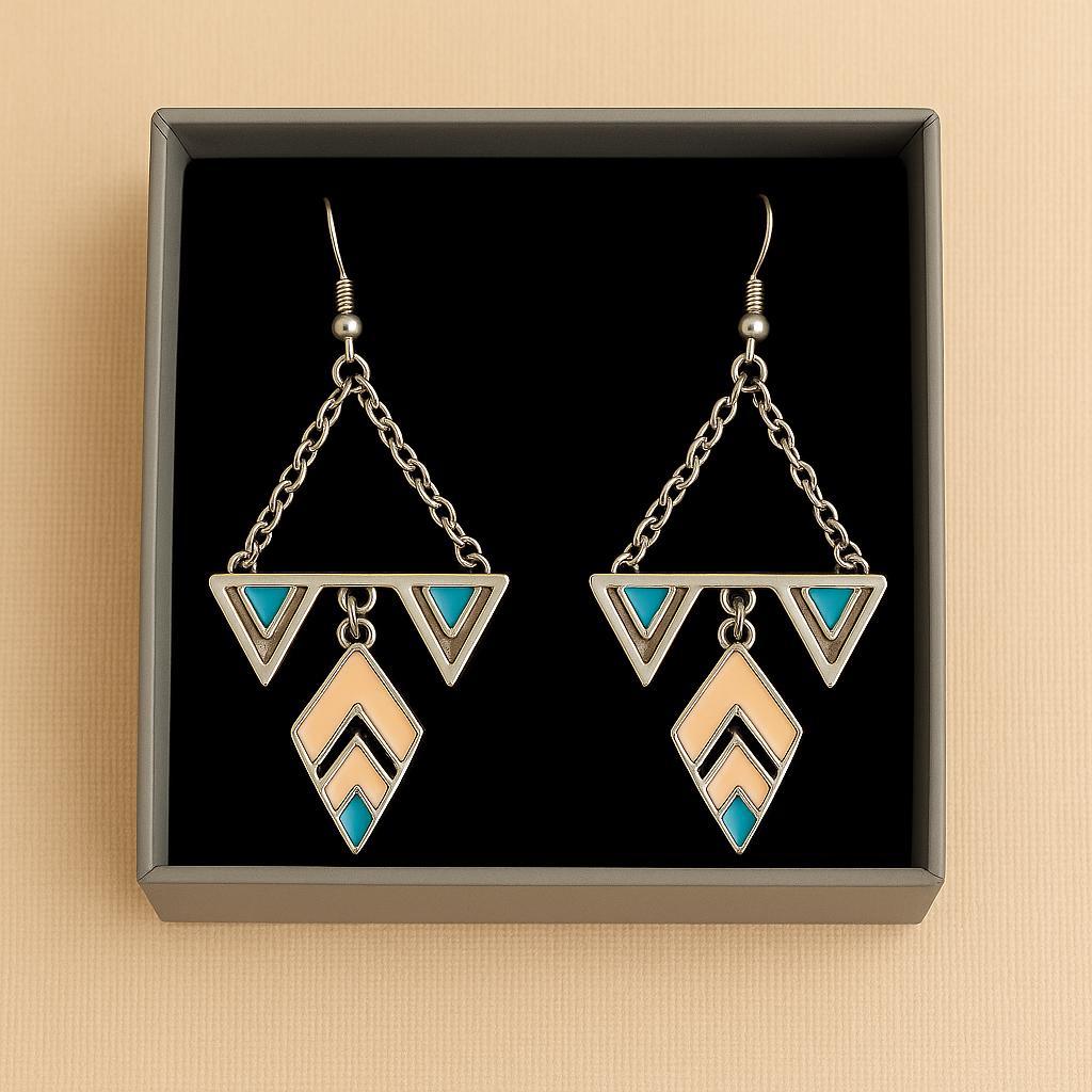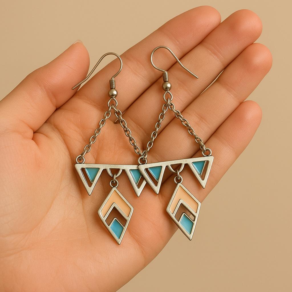✨ Add a touch of modern boho style to your look with these stunning geometric dangle earrings. Featuring silver-tone triangle and diamond shapes with turquoise and beige enamel accents, these earrings combine elegance and artistry in one unique design.