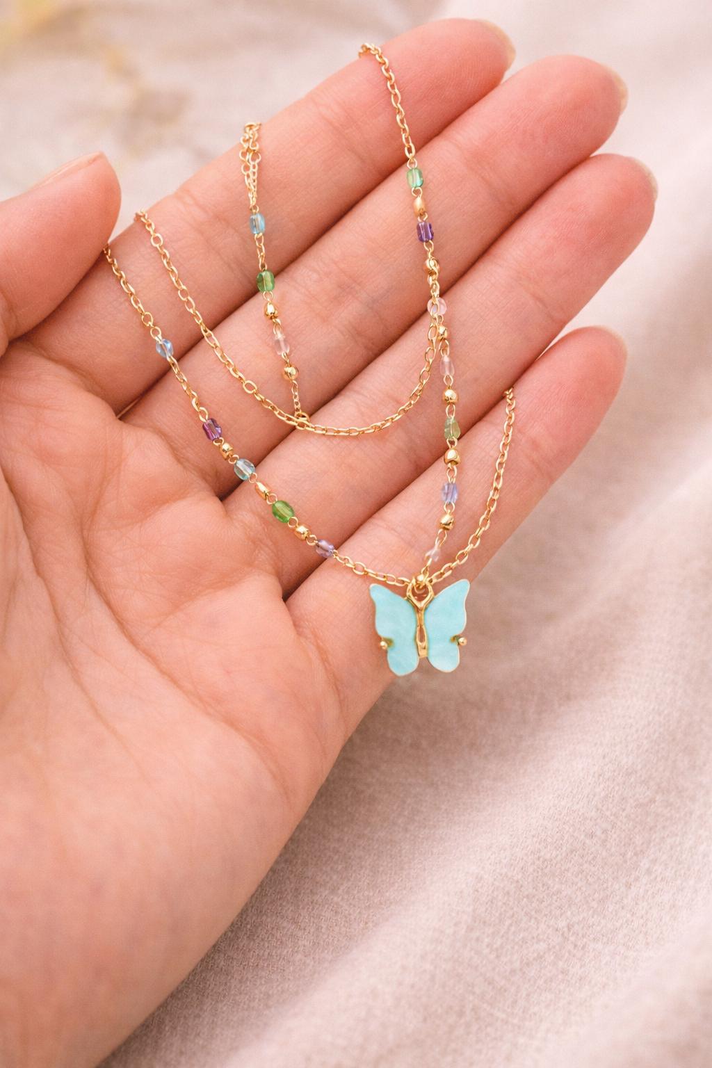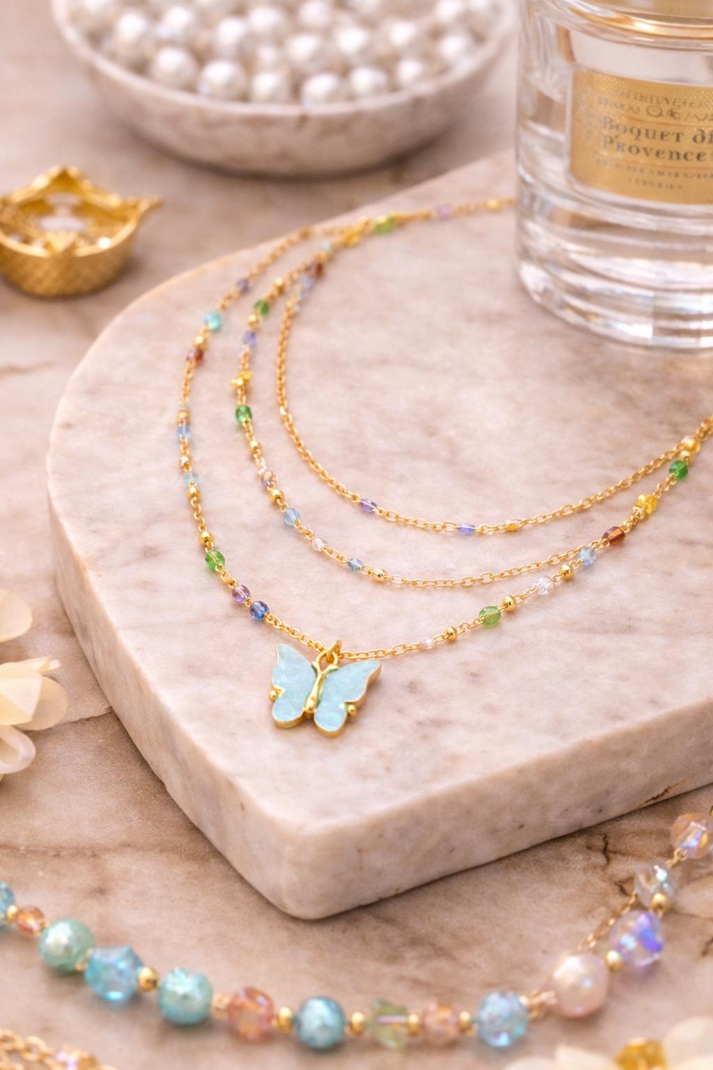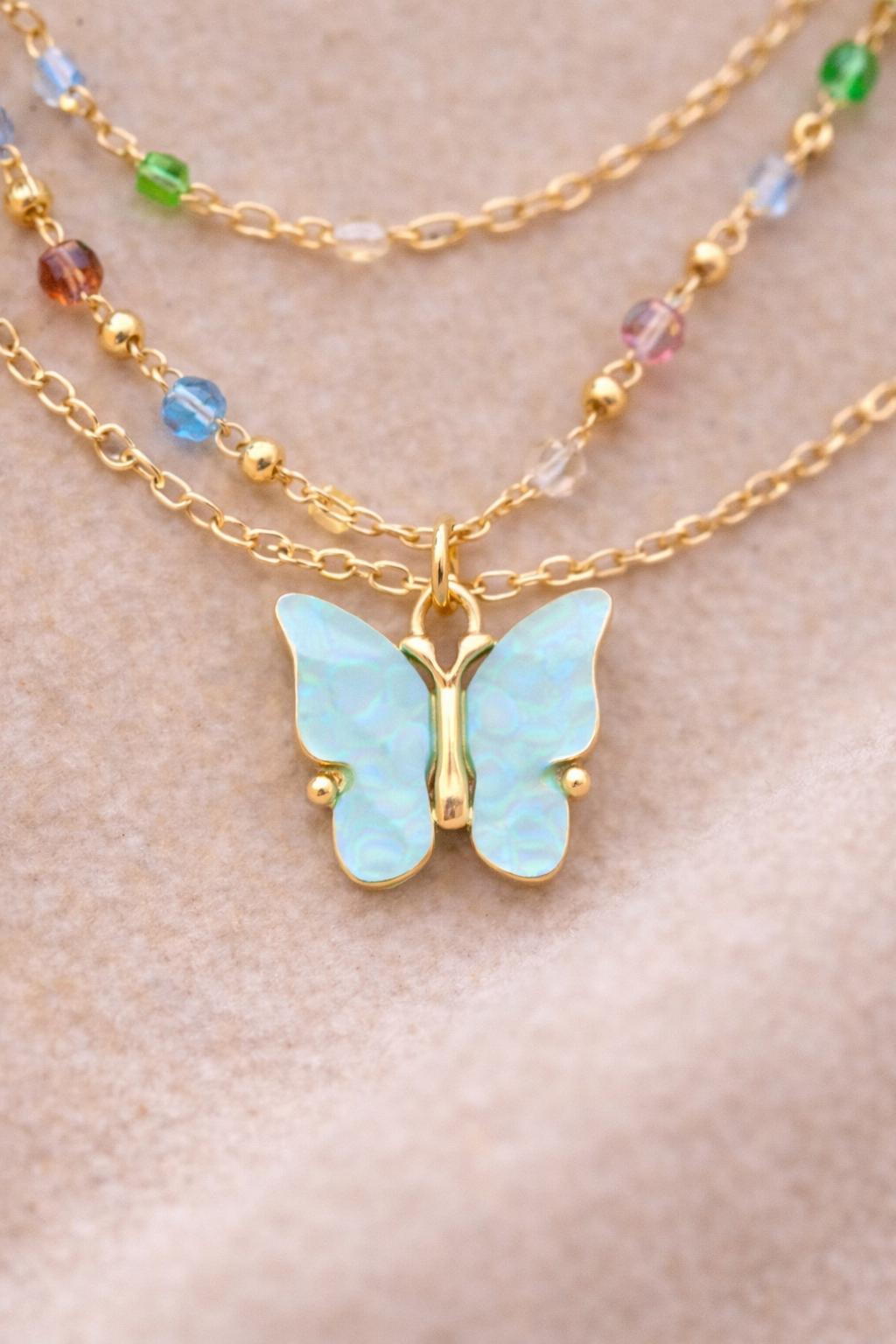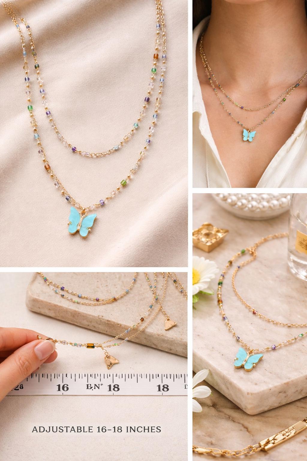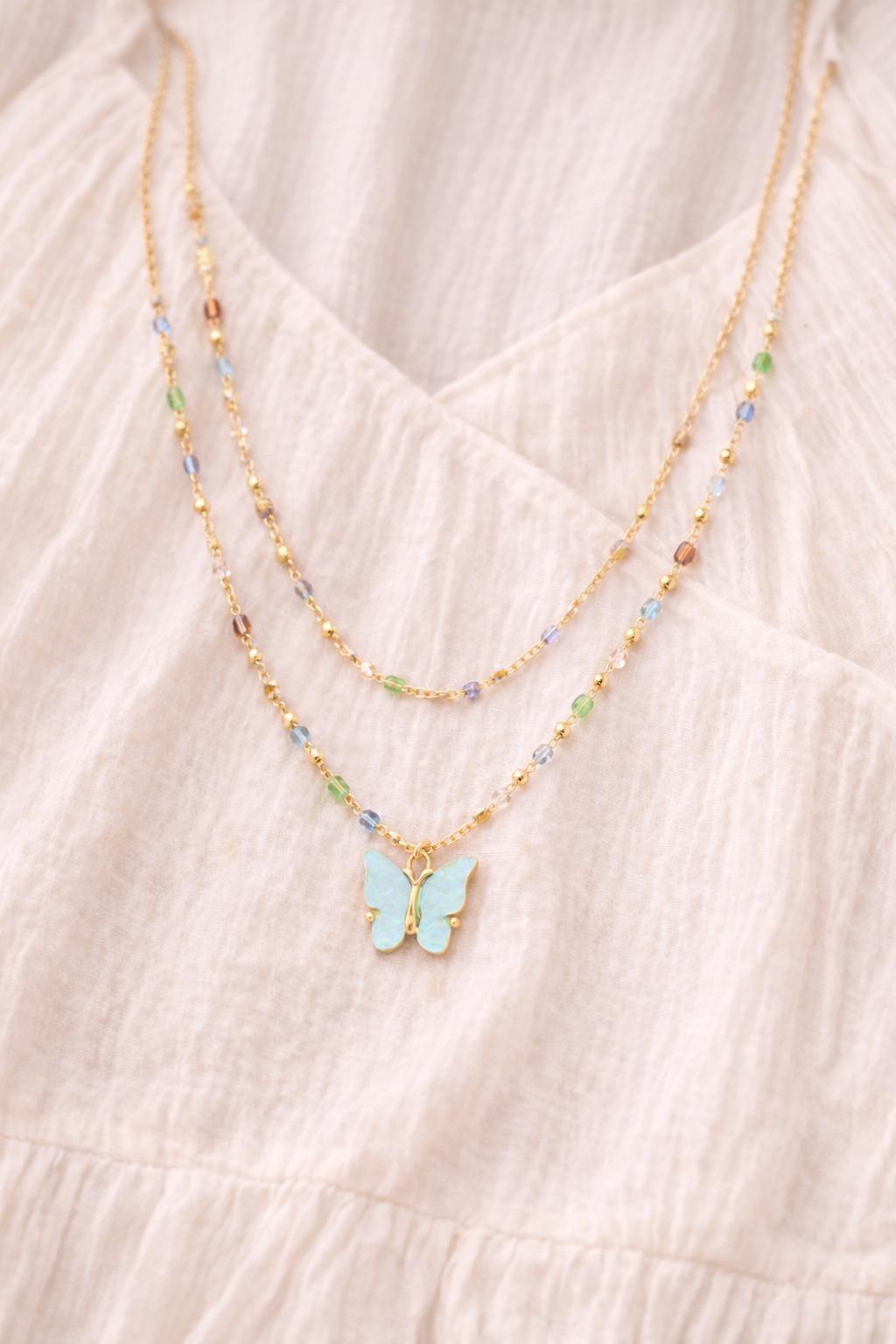 This delicate butterfly necklace features a graceful butterfly pendant paired with colorful glass beads and a gold-tone layered chain, creating a playful yet elegant look.