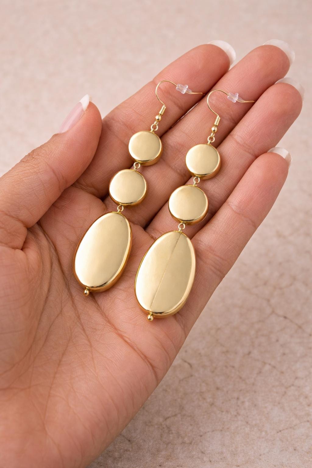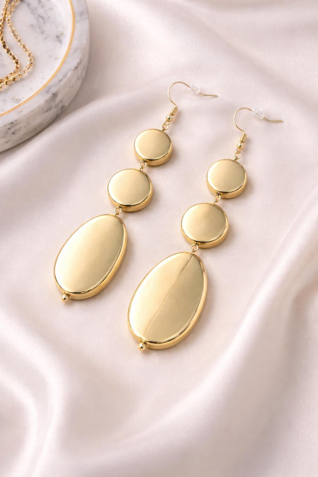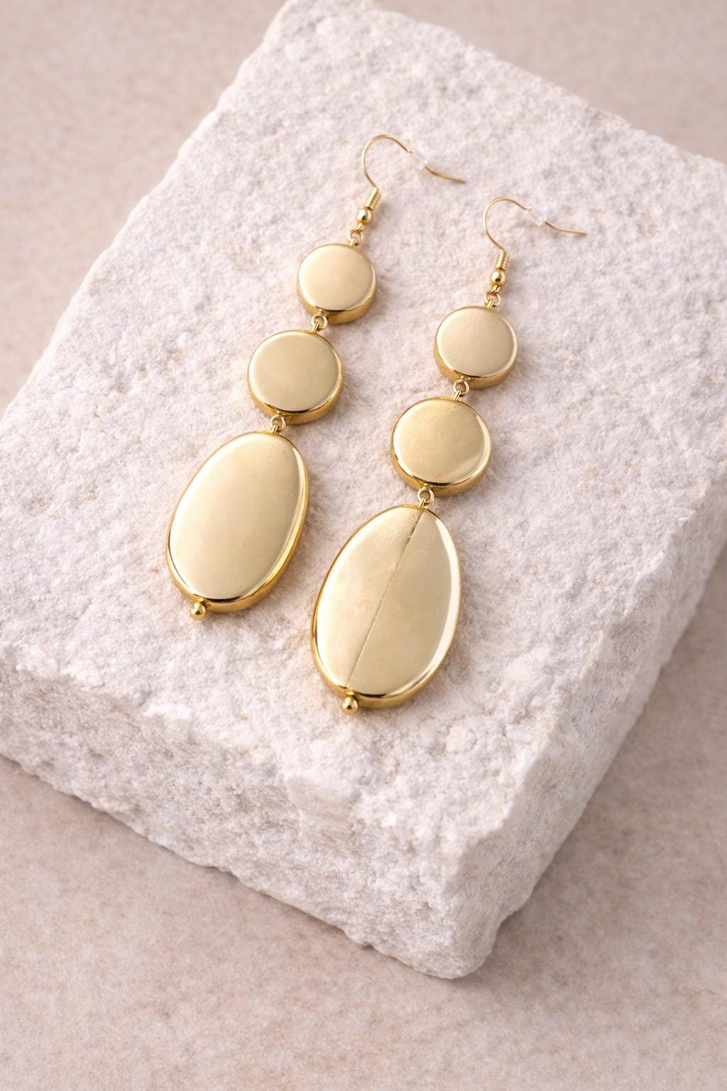 These elegant gold drop earrings feature a sleek, polished design with layered oval shapes that create a modern and timeless silhouette. Lightweight yet eye-catching, they move beautifully with every step and elevate both casual and dressy looks.