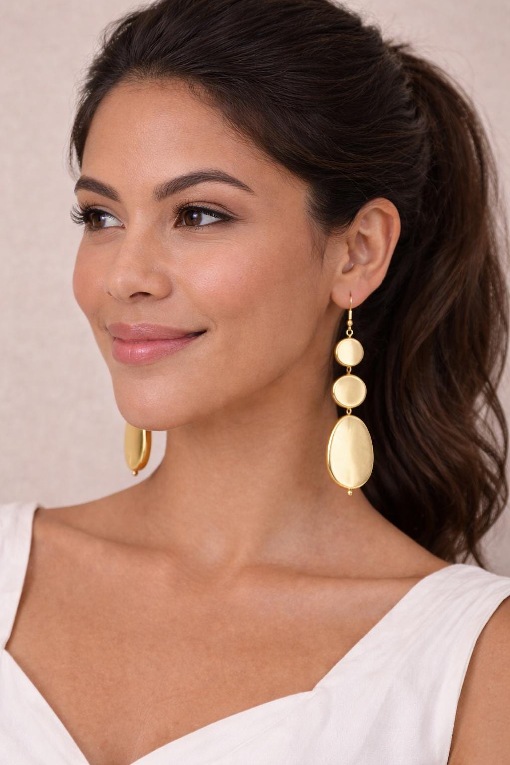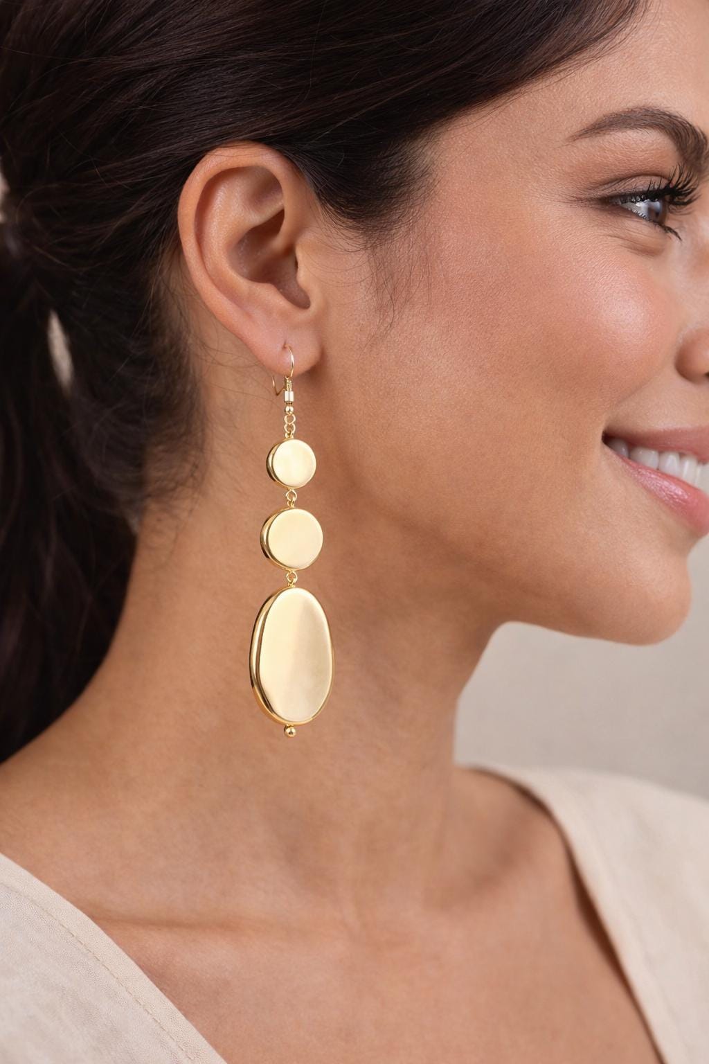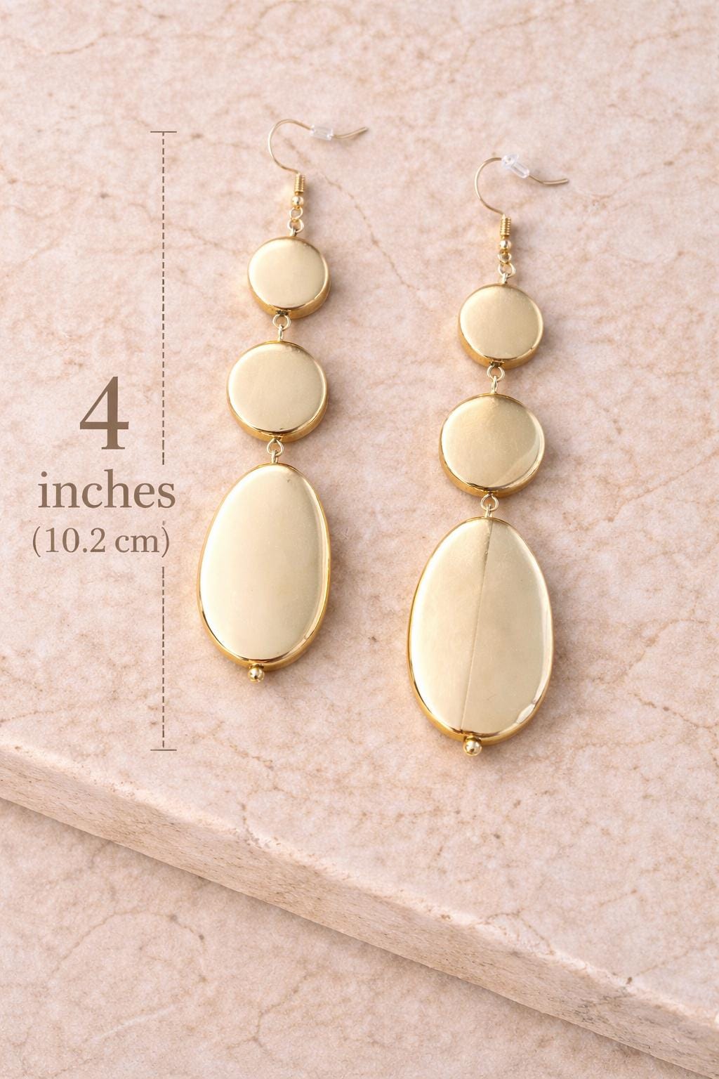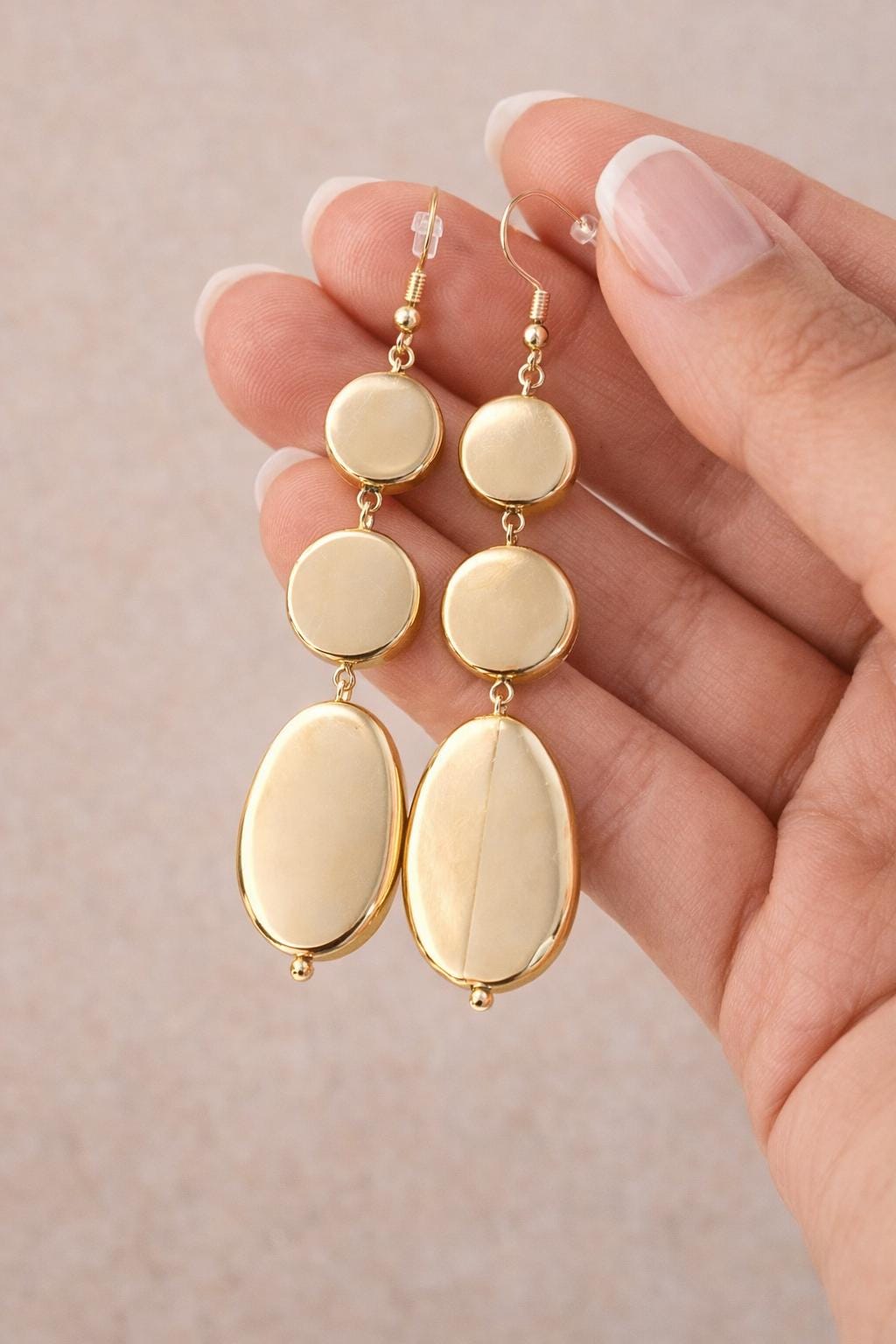These elegant gold drop earrings feature a sleek, polished design with layered oval shapes that create a modern and timeless silhouette. Lightweight yet eye-catching, they move beautifully with every step and elevate both casual and dressy looks.