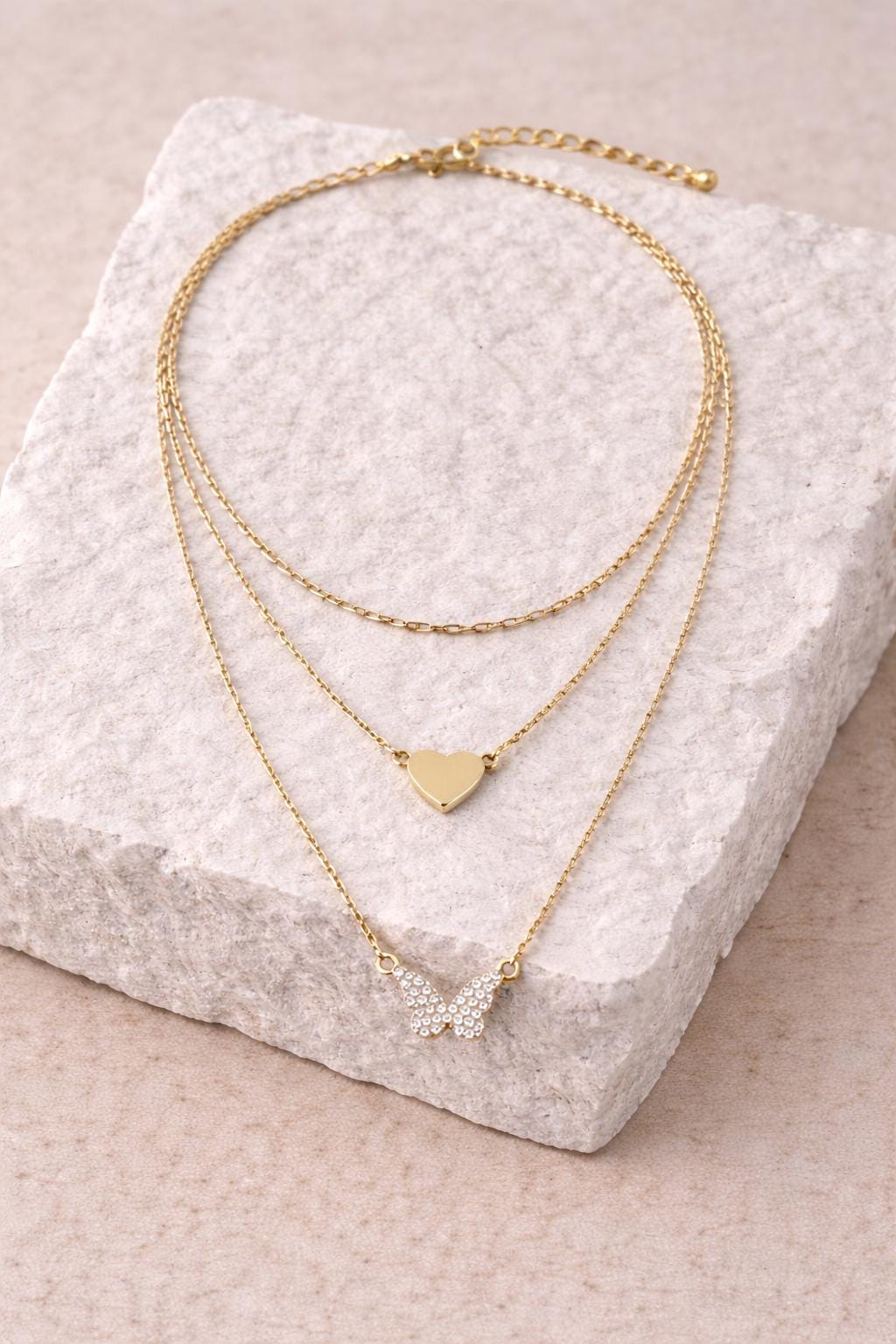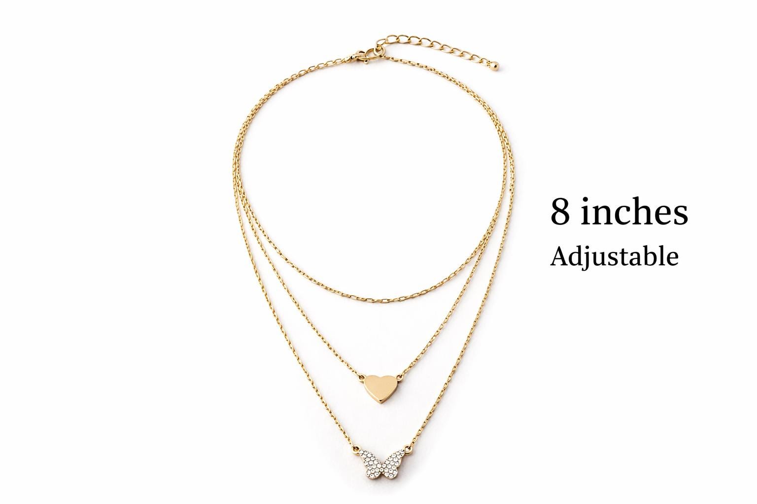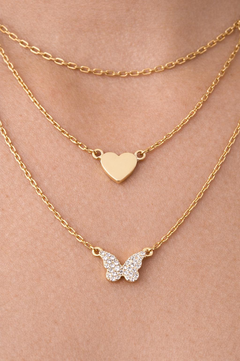This delicate layered gold necklace features a minimal heart charm paired with a sparkling butterfly pendant, creating a romantic and feminine look. Designed to be worn effortlessly, it adds a soft touch of elegance to everyday outfits and special occasions alike.