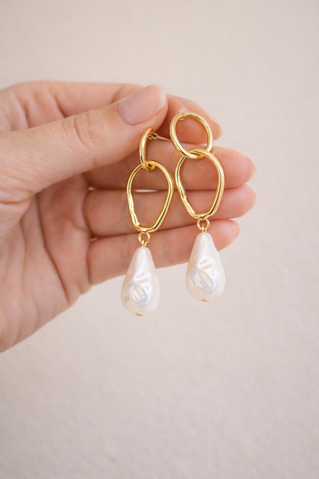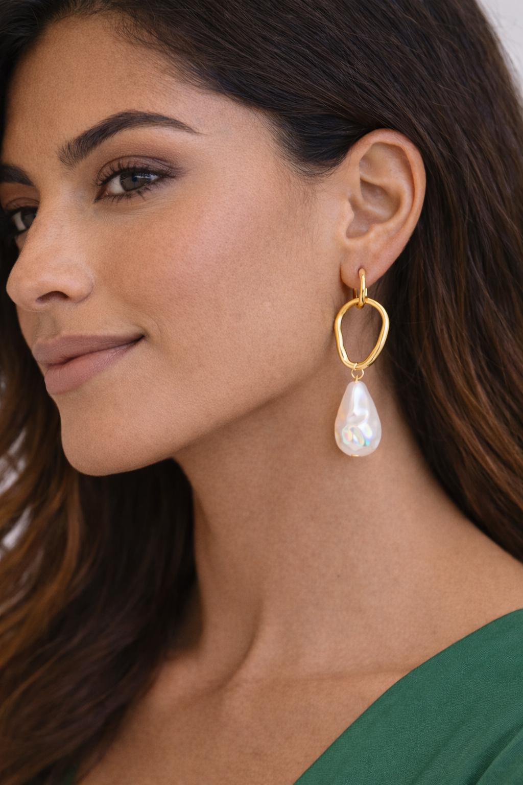 Their sculptural form adds a contemporary touch, while the soft pearlescent drop brings timeless elegance. Easy to style with casual outfits or evening looks, these statement earrings are designed to stand out without overpowering your style.