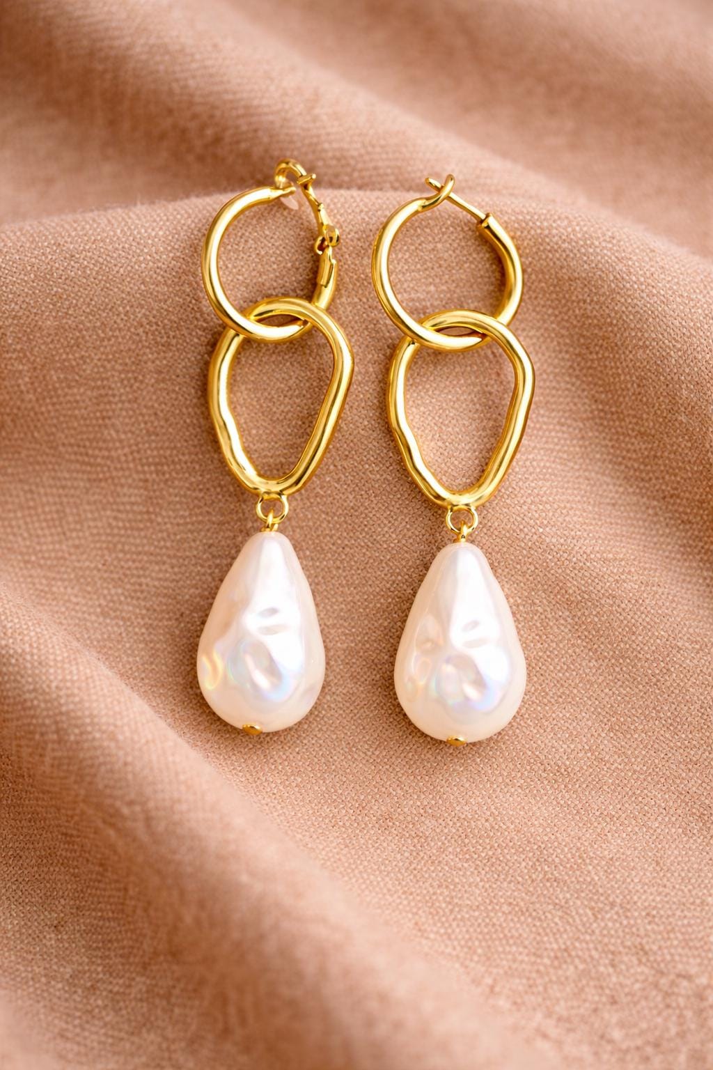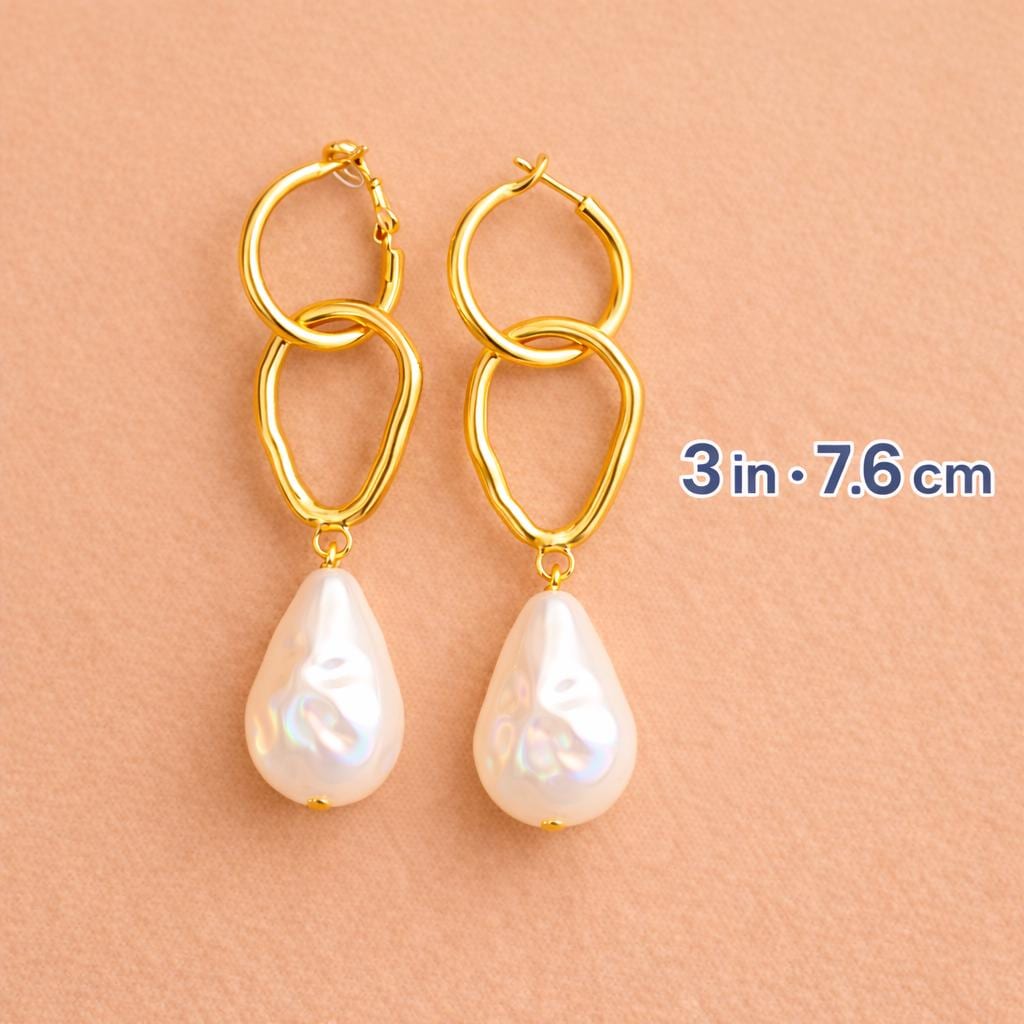 These elegant gold-tone drop earrings feature a modern hoop design with an organic-shaped link and a luminous pearl-effect teardrop charm. Lightweight yet eye-catching, they move beautifully with every step, making them perfect for both everyday wear and special occasions.