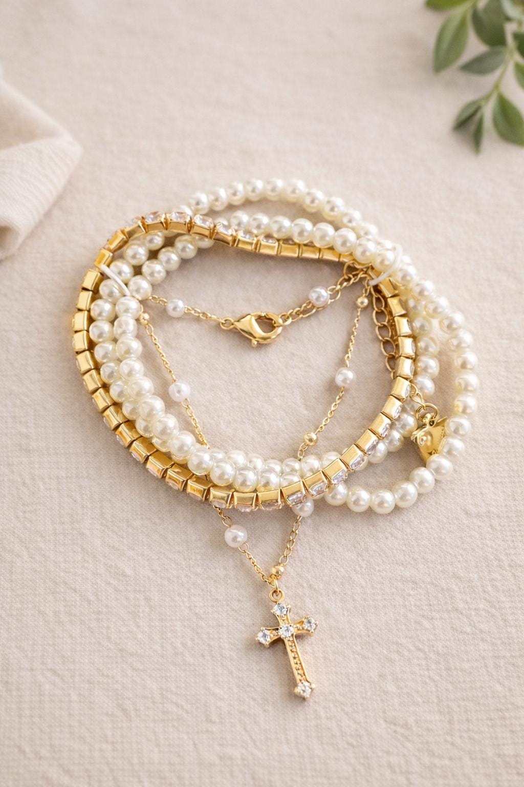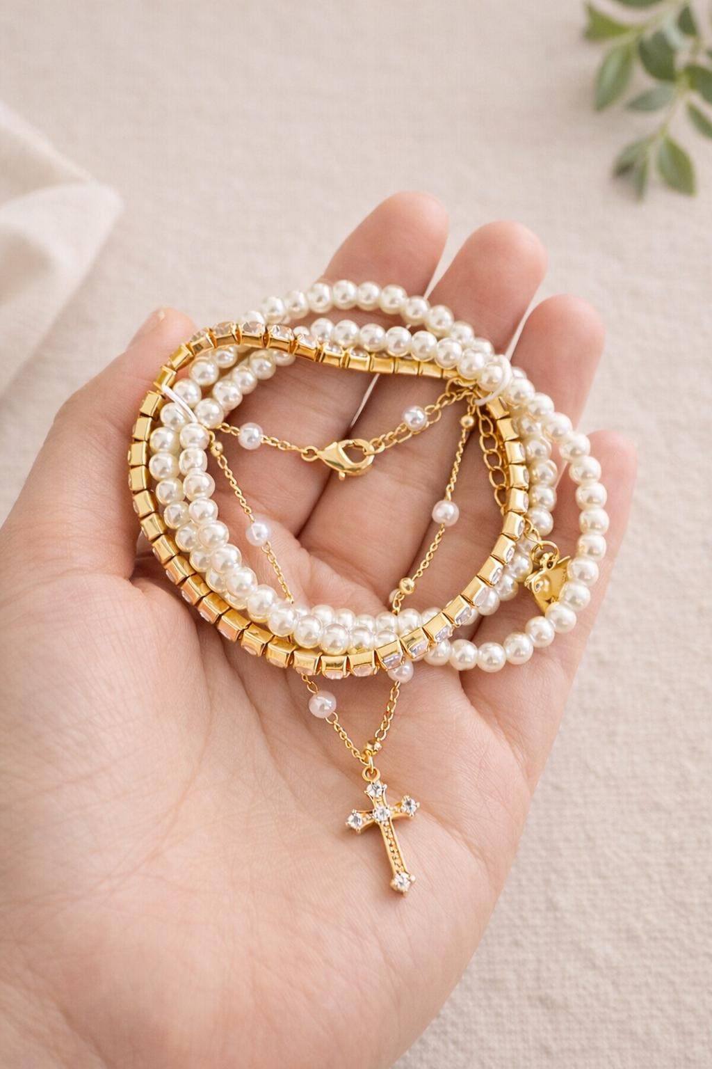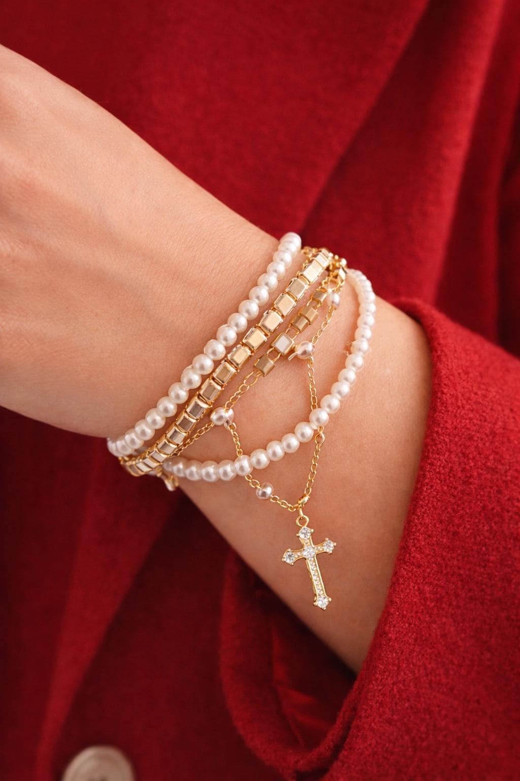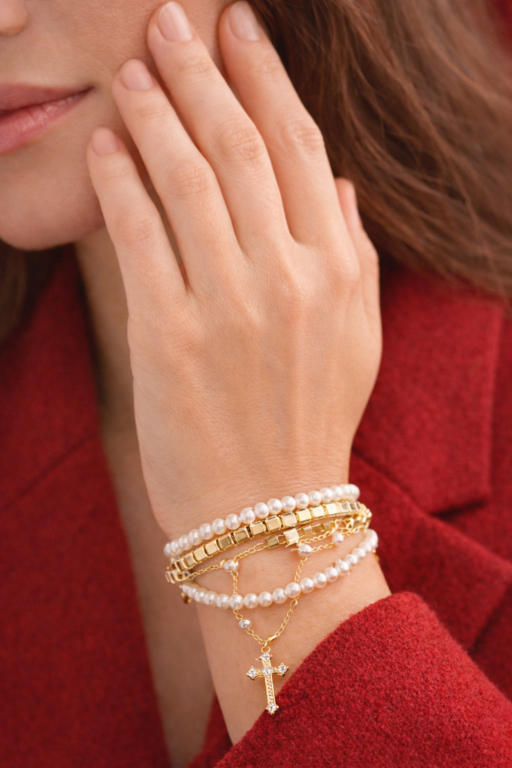 This layered gold and pearl bracelet features a delicate crystal cross charm, designed to bring together elegance, meaning, and timeless style. Its minimalist yet eye-catching design makes it perfect for daily wear or special occasions.